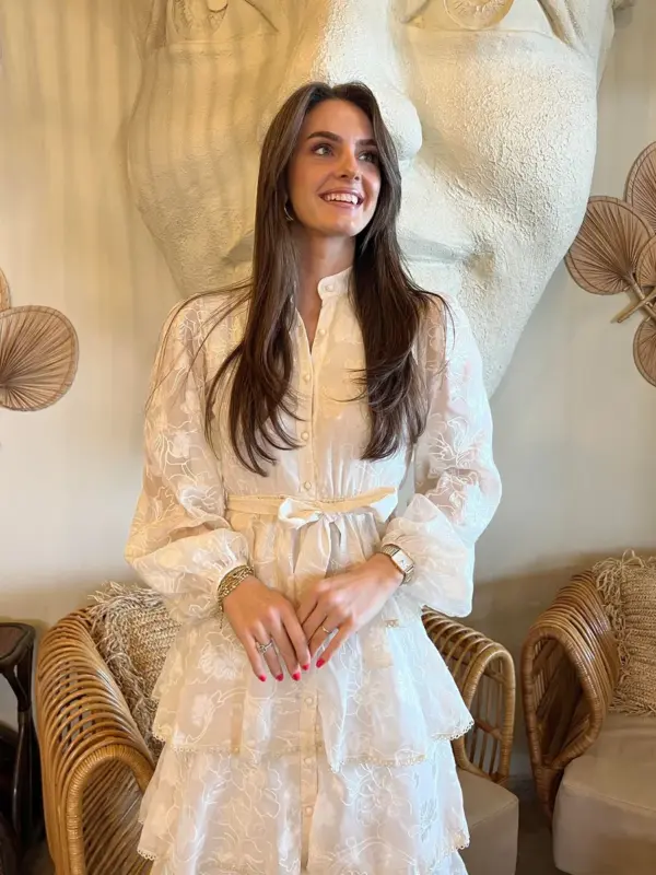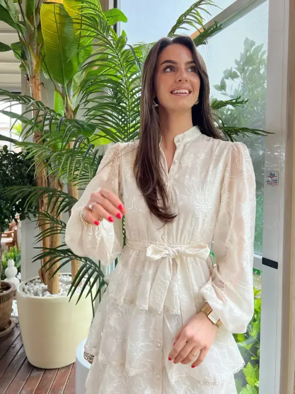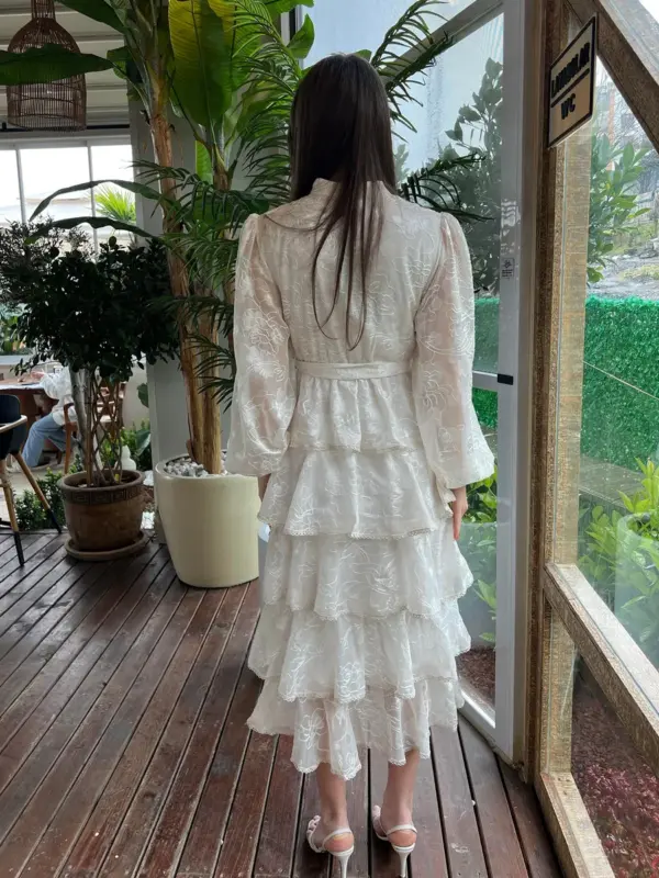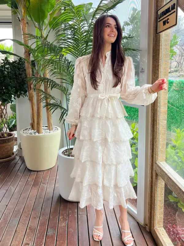 Ova romantična midi haljina odiše španskim duhom zahvaljujući bogatim volanima, koji joj daju dinamičnost i ženstvenost. Izrađena od tkanine sa delikatnim vezom, pruža sofisticiran i autentičan izgled inspirisan vintage modom.