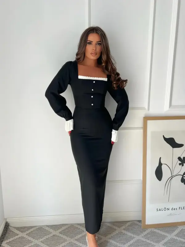 Midi haljina retro stila, strukirana i kontrastnog dizajna. Gornji dio je podstavljen, a haljina je presječena u struku kako bi naglasila figuru. Ukrasna dugmad na prednjem dijelu dodaju vintage notu, dok zvonasti rukavi pružaju dodatnu eleganciju. Pozadi ima izrez i skriveni ziper za lakše oblačenje. Haljina nije rastezljiva.