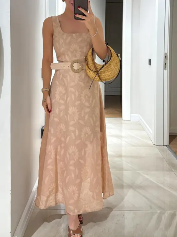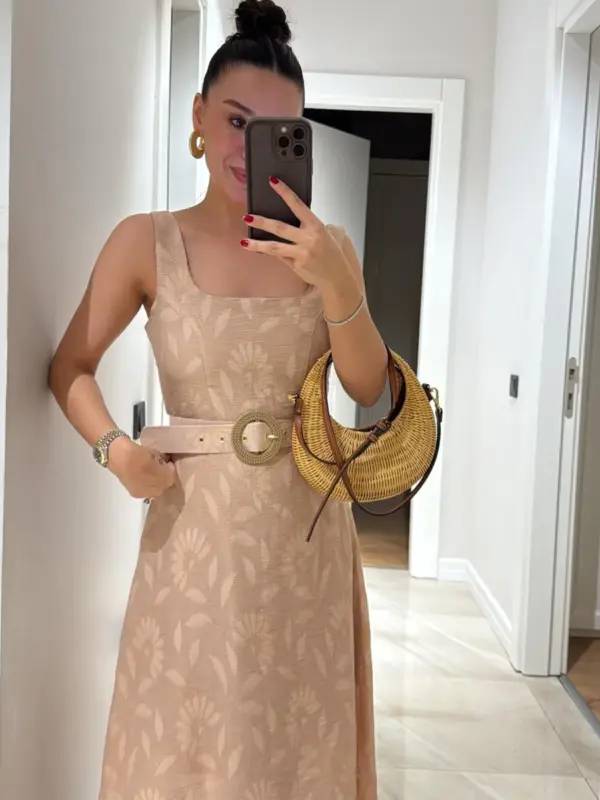 Ova midi haljina odiše bezvremenskom elegancijom i ženstvenošću. Strukirani gornji dio s četvrtastim izrezom savršeno naglašava figuru, dok lepršavi donji dio i tekstura tkanine donose sofisticiran i svjež izgled. Ukrasni kaiš dodatno naglašava struk i stvara balansiranu siluetu. Idealna je za svečane prilike, romantične večere ili ljetne proslave.