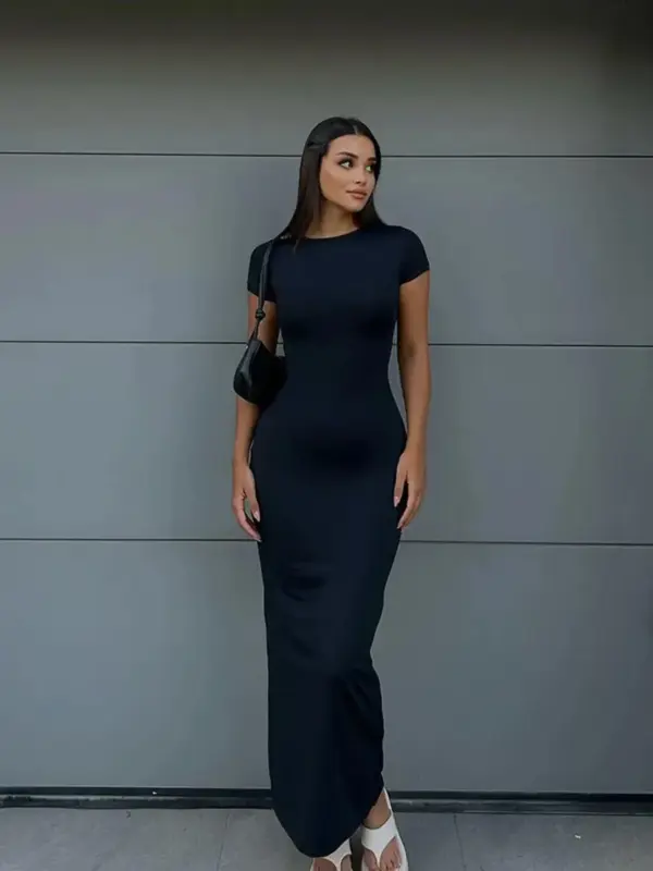 Ova basic midi haljina s kratkim rukavima i klasičnim okruglim okovratnikom savršen je izbor za ležerne kombinacije. Rastezljiv materijal osigurava udobnost i prilagođava se figuri, dok minimalistički dizajn omogućava lako stilizovanje za razne prilike.