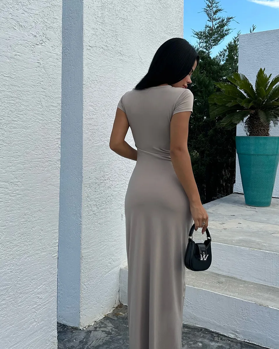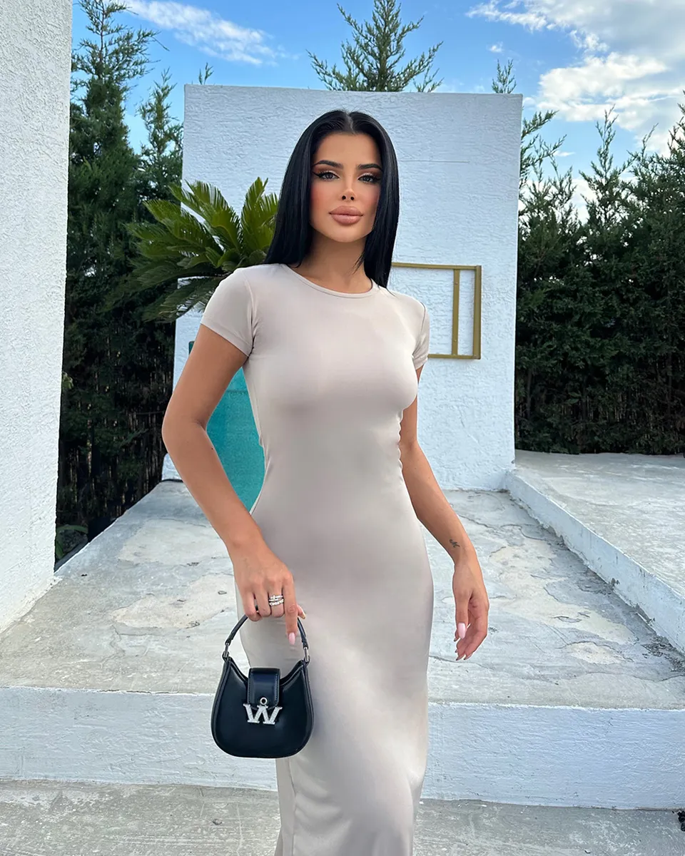 Ova basic midi haljina s kratkim rukavima i klasičnim okruglim okovratnikom savršen je izbor za ležerne kombinacije. Rastezljiv materijal osigurava udobnost i prilagođava se figuri, dok minimalistički dizajn omogućava lako stilizovanje za razne prilike.