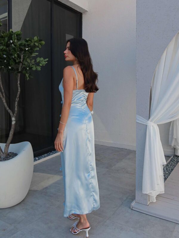 Ovaj model odiše suptilnom senzualnošću i profinjenom siluetom. Mekani drapirani izrez u stilu cowl necka nježno obavija dekolte, dok uska A-linija prati liniju tijela i lagano se širi prema podu. Sitne 3D cvjetne aplikacije raspršene po površini haljine unose romantičan studiosi detalj, a tanke, podesive bretele osiguravaju savršeno prianjanje i udobnost. Nevidljivi ziper na stražnjoj strani omogućava glatko oblačenje, a podstava garantira neprozirnost i fluidan pad tkanine, ali ipak preporučujemo nositi neutralne boje ispod.