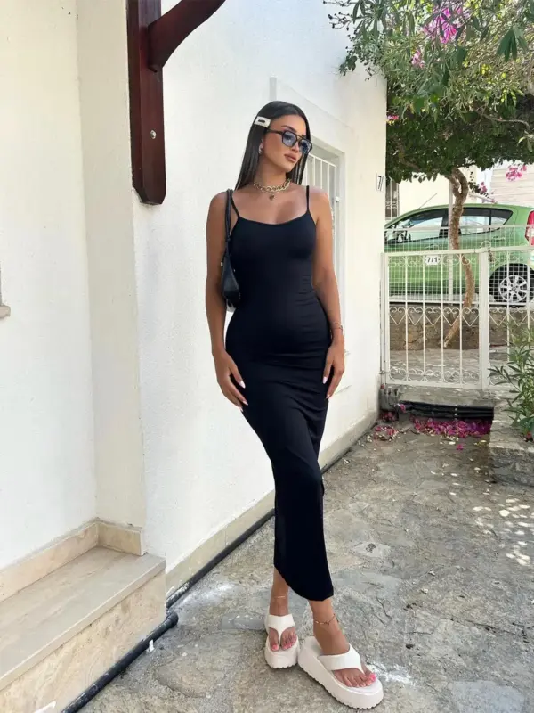 Ova elastična maxi haljina ističe figuru svojom uskom siluetom, dok otvorena leđa dodaju dozu senzualnosti. Napravljena od mekane i rastezljive tkanine, pruža maksimalnu udobnost i savršeno se prilagođava tijelu.
