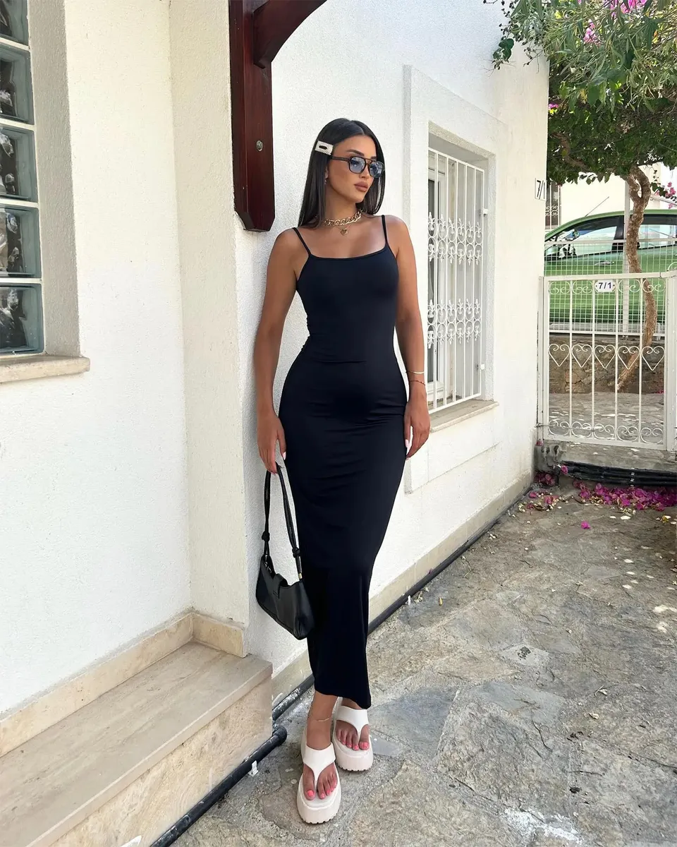 Ova elastična maxi haljina ističe figuru svojom uskom siluetom, dok otvorena leđa dodaju dozu senzualnosti. Napravljena od mekane i rastezljive tkanine, pruža maksimalnu udobnost i savršeno se prilagođava tijelu.
