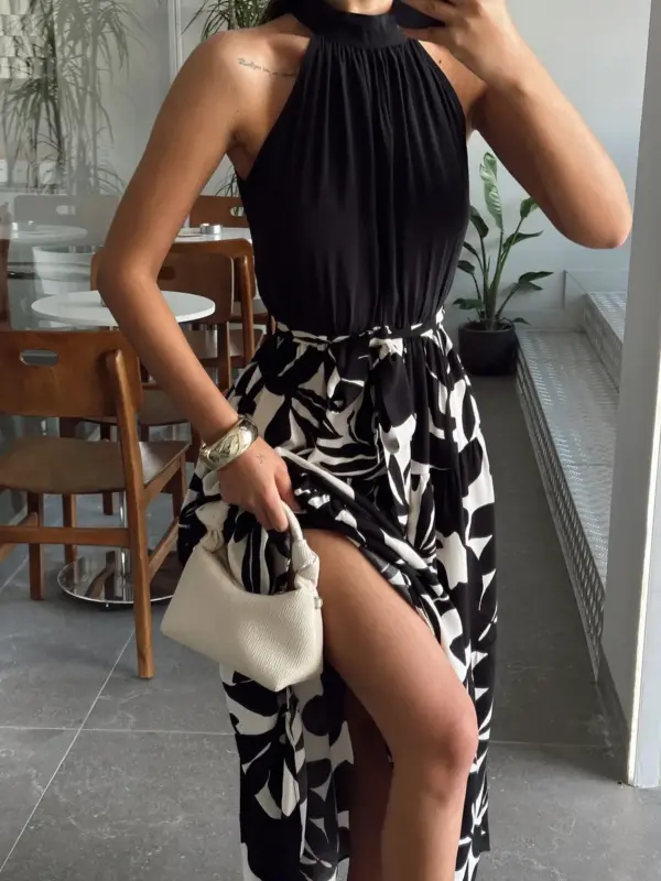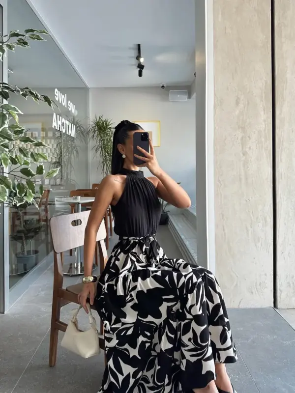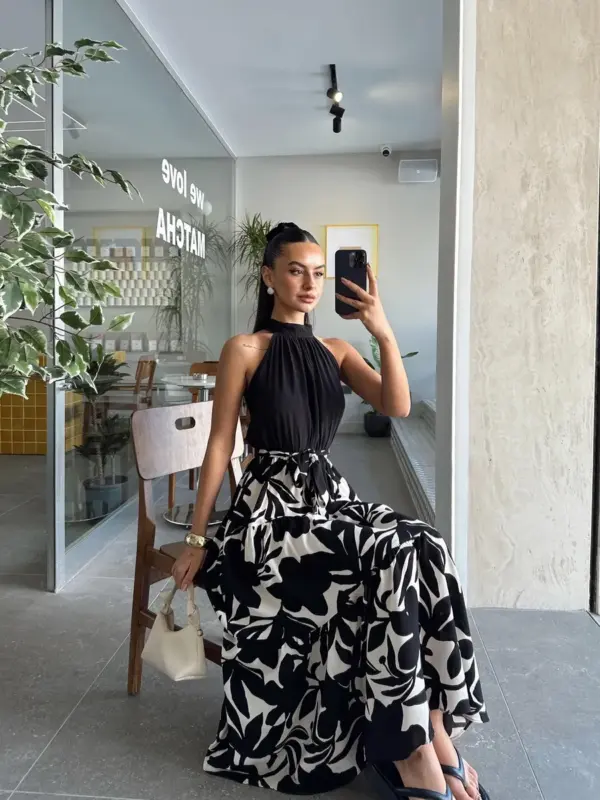 Savršena kombinacija udobnosti i stila! Ova haljina sa crnim gornjim dijelom i upečatljivim cvjetnim donjim dijelom idealna je za šetnje, kafu u gradu ili ljetne večeri.