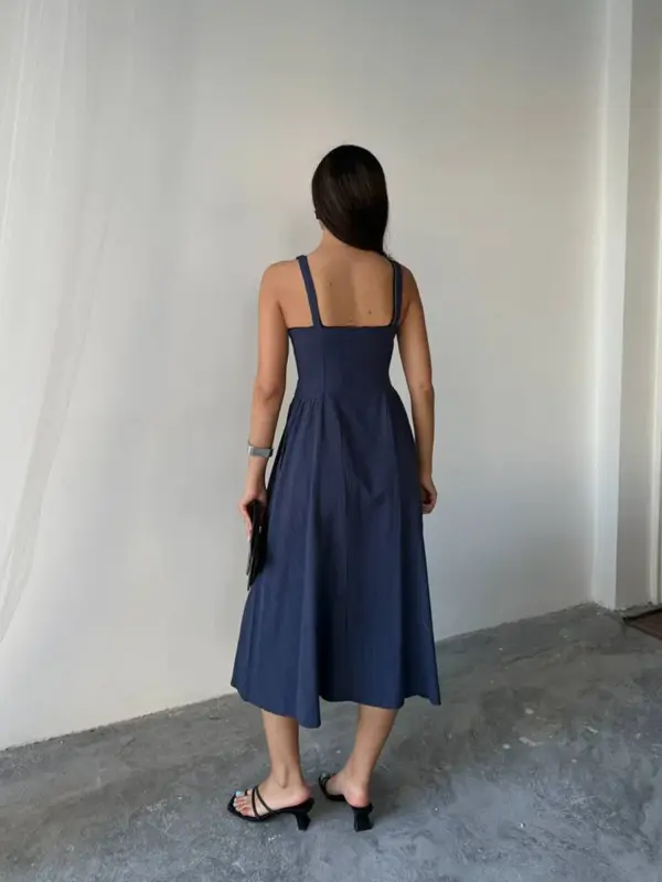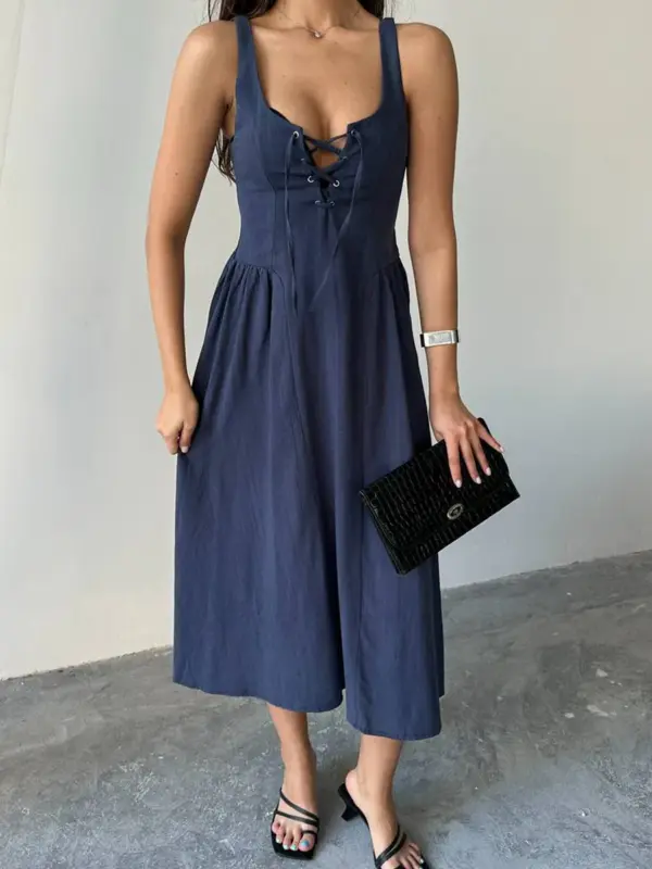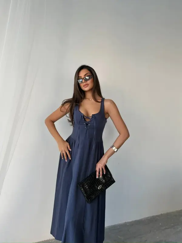 Ova šarmantna midi haljina je savršen spoj udobnosti i romantičnog stila! Izrađena od laganog materijala (vjerojatno mješavina s lanom), idealna je za tople dane. Detalj vezanja sprijeda, poput korzeta, dodaje poseban šarm i omogućava blago prilagođavanje.