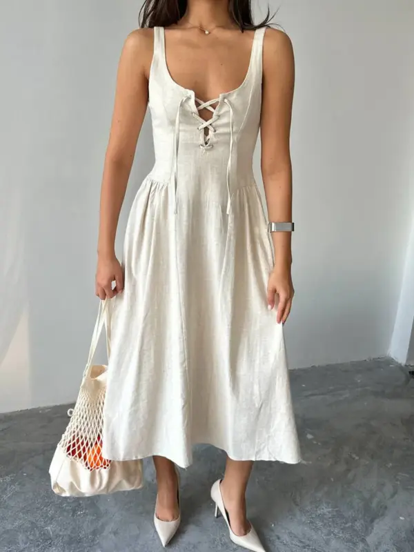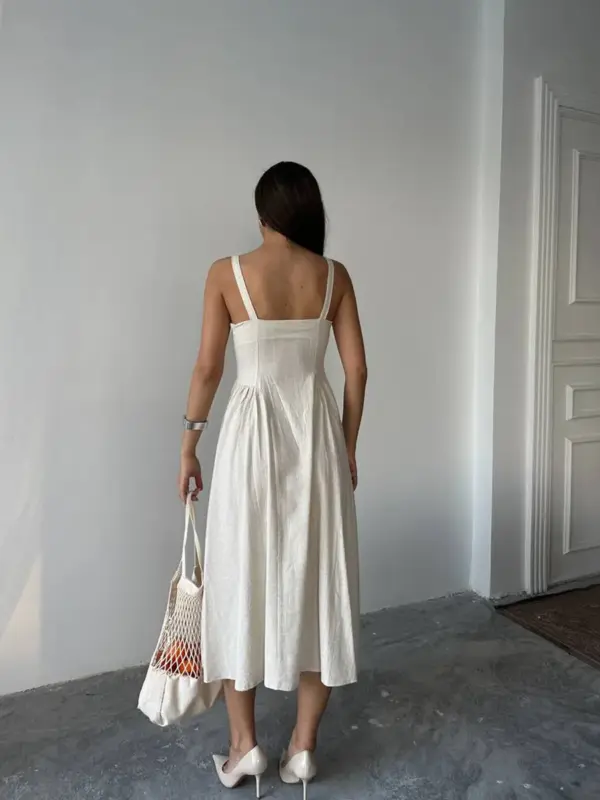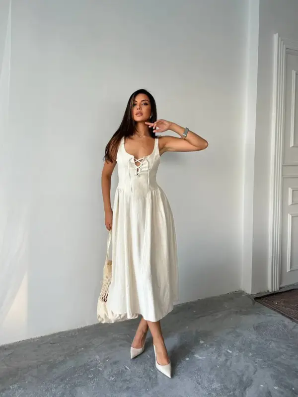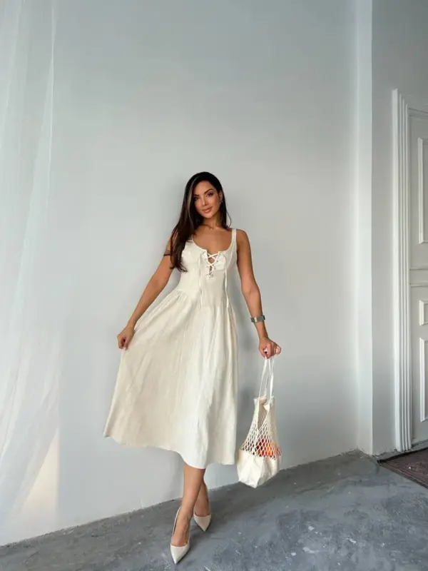 Ova šarmantna midi haljina je savršen spoj udobnosti i romantičnog stila! Izrađena od laganog materijala (vjerojatno mješavina s lanom), idealna je za tople dane. Detalj vezanja sprijeda, poput korzeta, dodaje poseban šarm i omogućava blago prilagođavanje.