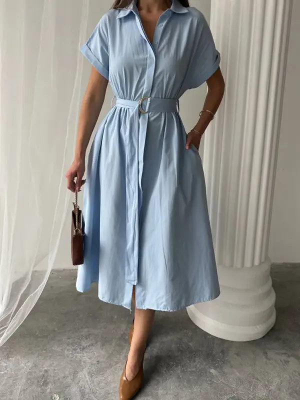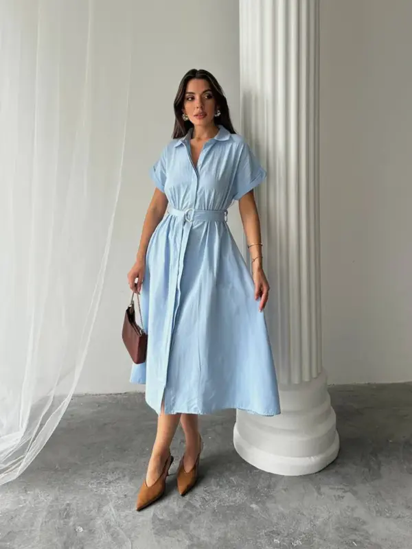 Ova elegantna haljina kombinuje klasičan dizajn i modernu funkcionalnost. Kragna i dugmići po cijeloj sredini stvaraju vintage atmosferu, dok se kroj pri dnu široko širi, pružajući slobodu pokreta i ženstveni izgled.
