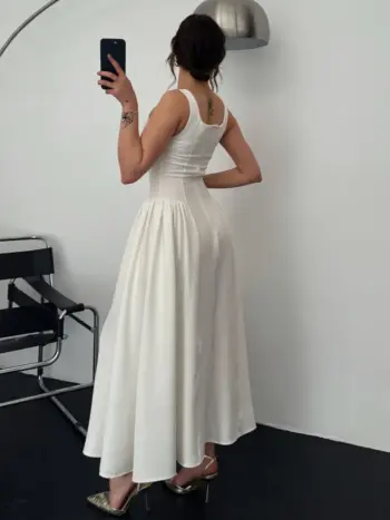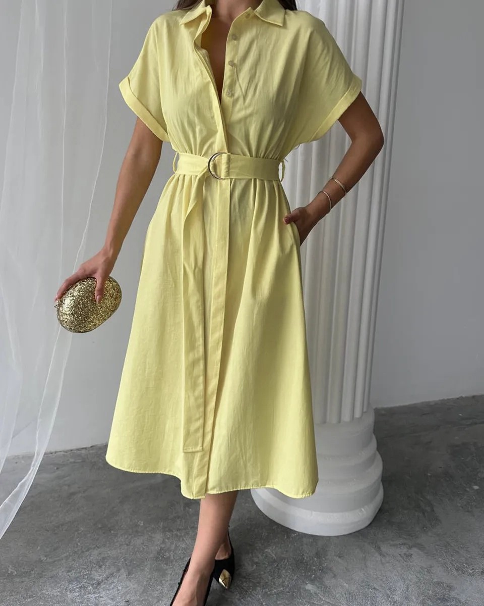 Ova elegantna haljina kombinuje klasičan dizajn i modernu funkcionalnost. Kragna i dugmići po cijeloj sredini stvaraju vintage atmosferu, dok se kroj pri dnu široko širi, pružajući slobodu pokreta i ženstveni izgled.
