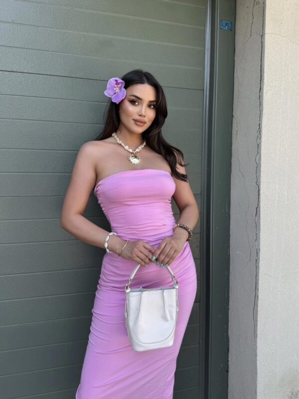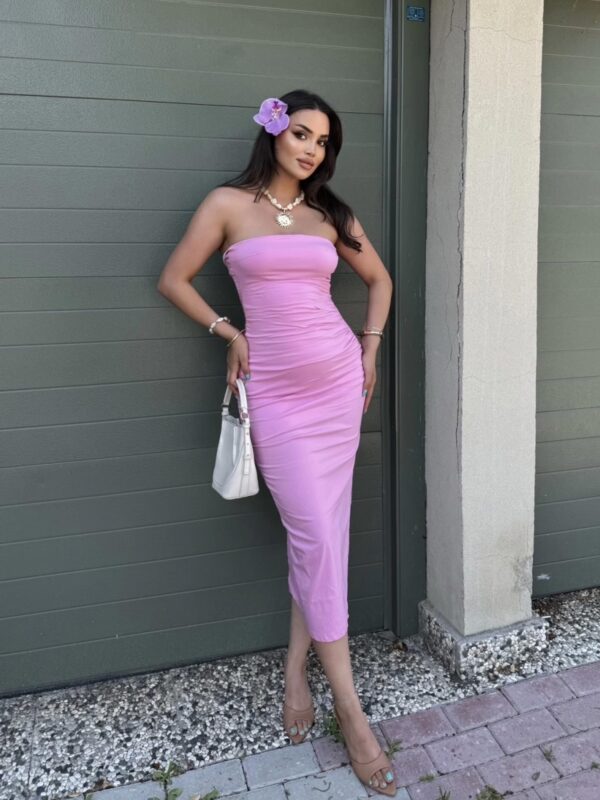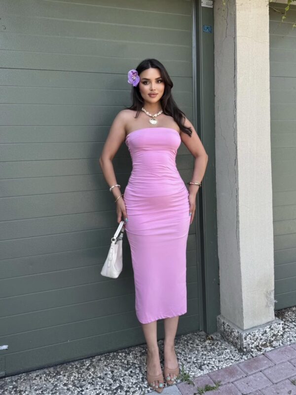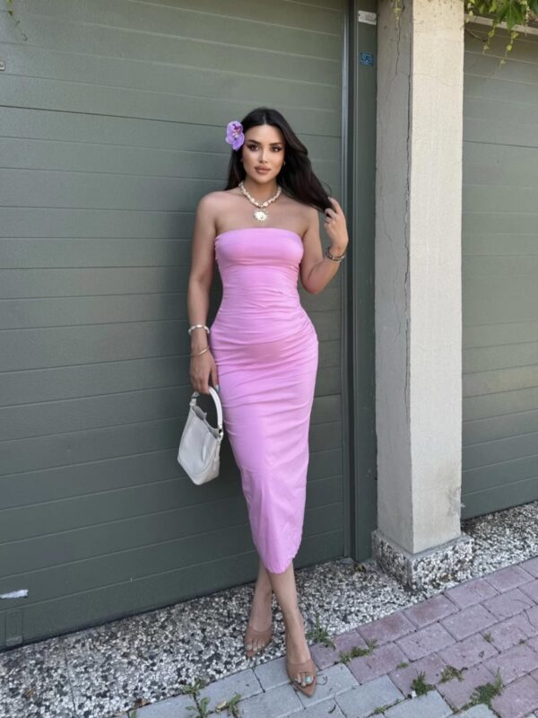 Ova prozračna midi haljina bez naramenica krojena je od rastezljive tkanine, pružajući savršeno prianjanje uz tijelo i istovremeno izuzetnu udobnost. Gornji rub opremljen je diskretnom anti-slip trakom koja sprječava spuštanje i osigurava sigurno pristajanje, dok izrez na stražnjoj strani pridonosi slobodi pokreta i profinjenom izgledu. Skriveni stražnji ziper omogućava lako oblačenje bez narušavanja linije kroja.
