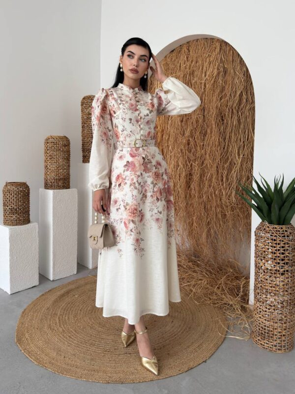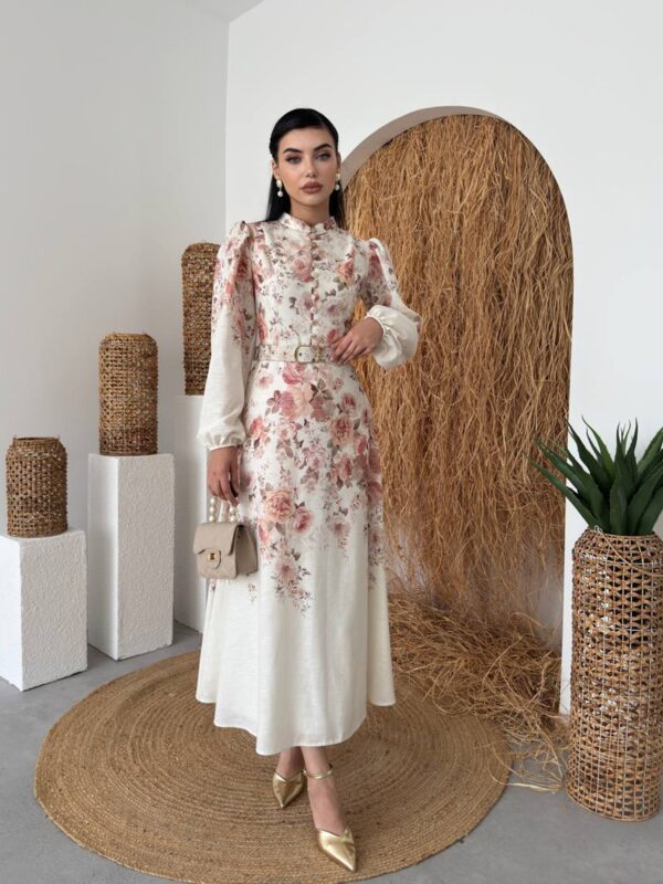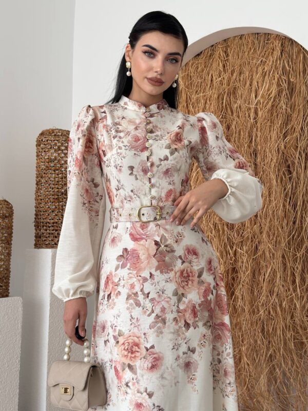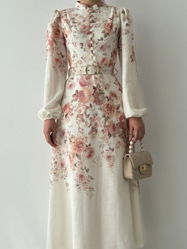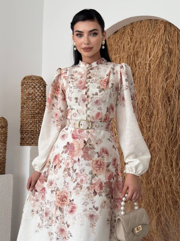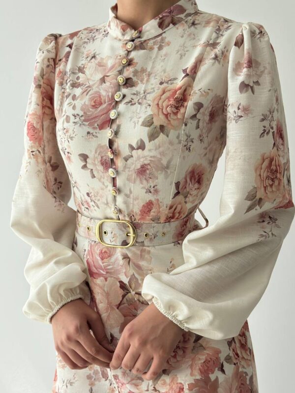 Ova elegantna midi haljina unosi dozu klasike i ženstvenosti u svaki ormar. Cvjetni dezen u kombinaciji s visokim ovratnikom i puf rukavima stvara sofisticiran i bezvremenski izgled. Kaiš u struku naglašava siluetu, dok midi kroj pruža dodatnu gracioznost. Haljina je podstavljena za dodatnu udobnost i ima diskretan ziper sa strane za lako oblačenje.