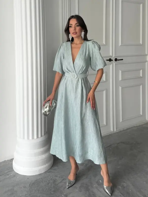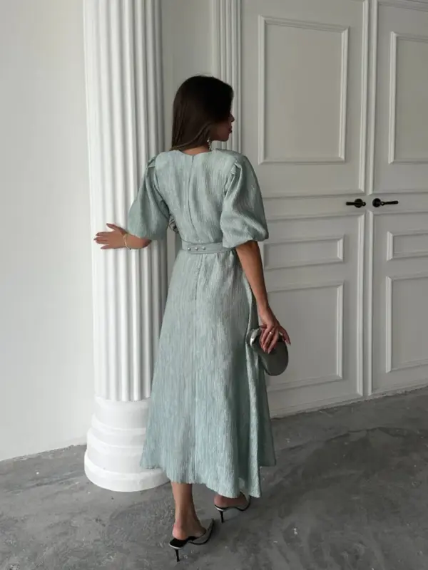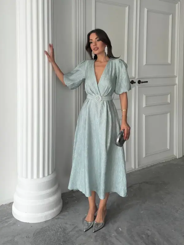 Ova sofisticirana midi haljina stvorena je za dame koje vole klasiku s dozom glamura. Lagano sjajna tkanina s plisiranim efektom pada u A-kroj koji laskavo oblikuje figuru, dok duboki V-izrez i puf rukavi daju romantičan, ali moćan izgled. Ukrasni pojas s prstenastom kopčom dodatno naglašava struk i pruža dodatnu definiciju silueti. Zatvara se diskretnim rajsferšlusom na leđima, a ramena su podstavljena spužvicama za dodatnu strukturu i eleganciju.