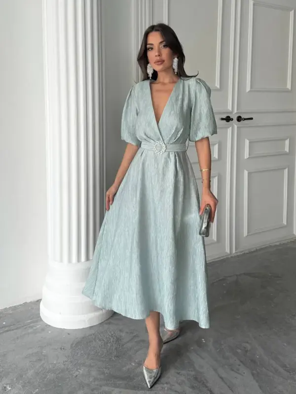 Ova sofisticirana midi haljina stvorena je za dame koje vole klasiku s dozom glamura. Lagano sjajna tkanina s plisiranim efektom pada u A-kroj koji laskavo oblikuje figuru, dok duboki V-izrez i puf rukavi daju romantičan, ali moćan izgled. Ukrasni pojas s prstenastom kopčom dodatno naglašava struk i pruža dodatnu definiciju silueti. Zatvara se diskretnim rajsferšlusom na leđima, a ramena su podstavljena spužvicama za dodatnu strukturu i eleganciju.