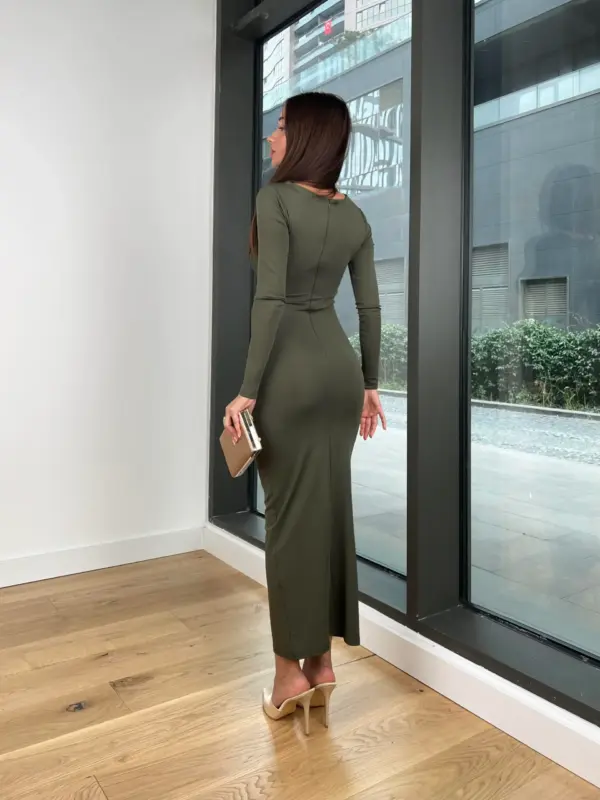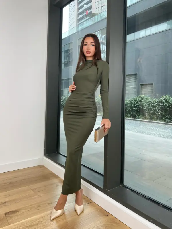 Midi haljina od rastezljivog materijala, jednostavna i elegantna. Nabori u struku naglašavaju figuru, a rastezljiv materijal osigurava udobnost i savršeno prilagođavanje tijelu.