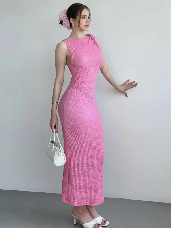 Ova elegantna haljina savršen je izbor za sve prilike kada želiš jednostavan, ali upečatljiv izgled! Rebrasta tekstura dodaje dinamiku silueti, dok kroj koji prati liniju tijela lijepo ističe figuru. Jednostavan gornji dio s detaljem čvora na ramenu donosi notu suptilne elegancije. Haljina je lagano providna i pruža udobnost zahvaljujući rastezljivom materijalu.
