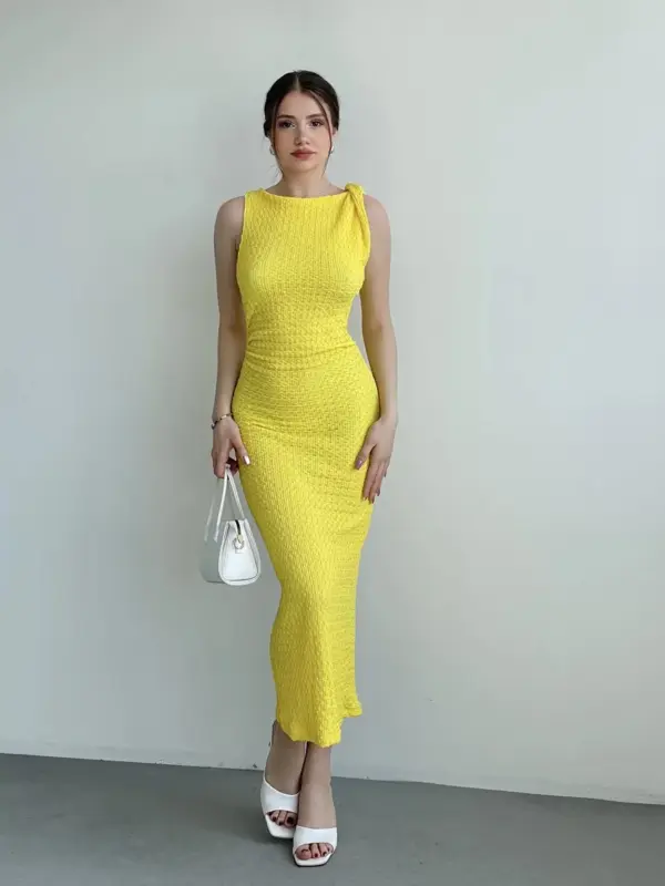 Ova elegantna haljina savršen je izbor za sve prilike kada želiš jednostavan, ali upečatljiv izgled! Rebrasta tekstura dodaje dinamiku silueti, dok kroj koji prati liniju tijela lijepo ističe figuru. Jednostavan gornji dio s detaljem čvora na ramenu donosi notu suptilne elegancije. Haljina je lagano providna i pruža udobnost zahvaljujući rastezljivom materijalu.