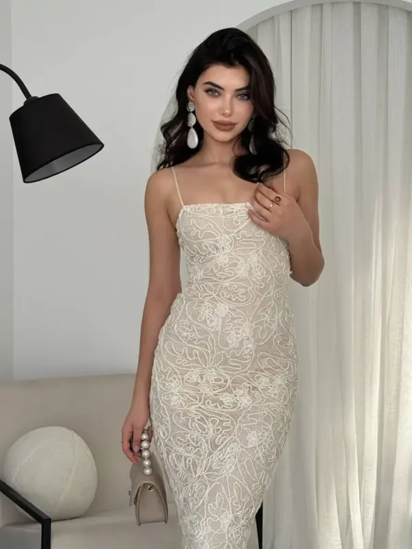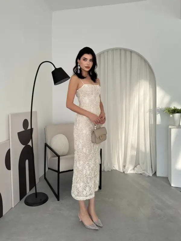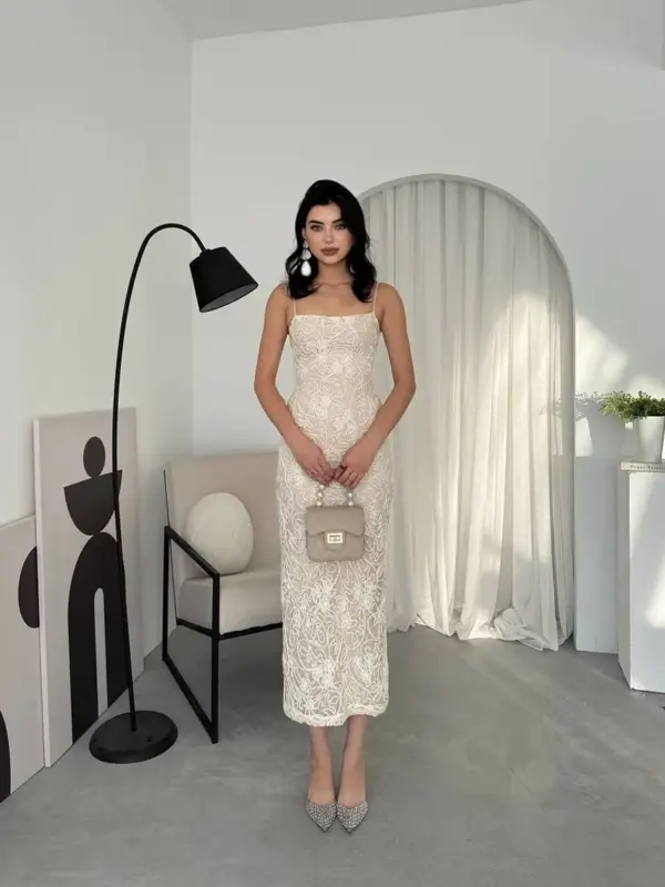 Ova uska midi haljina na bretele savršeno naglašava vašu figuru i donosi dašak romantizma u svakom koraku! Sa detaljima veza koji prelaze preko haljine, u nježnim cream nijansama, idealna je za elegantne prilike i večernje izlaske. Podstavljena za dodatnu udobnost i kvalitet, a ziper pozadi omogućava lakše oblačenje.