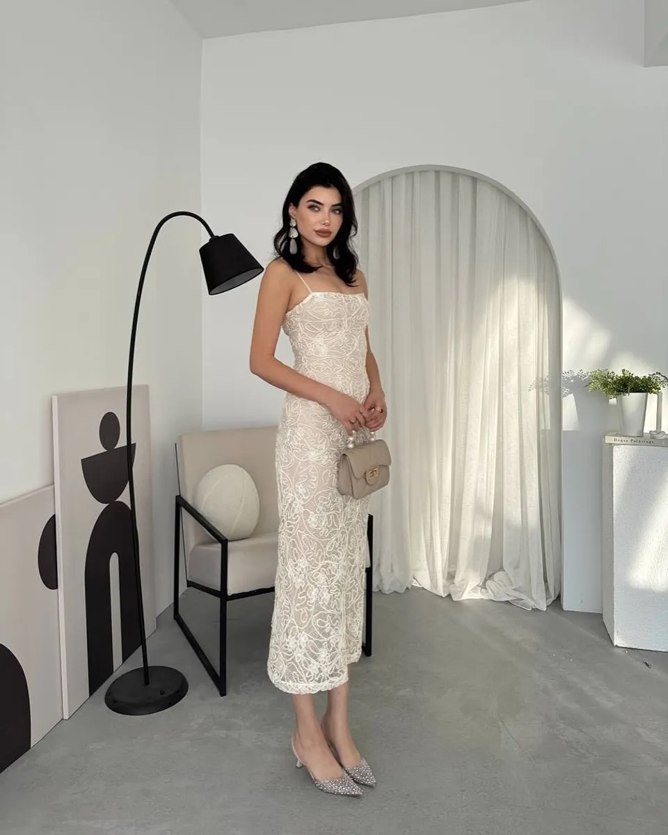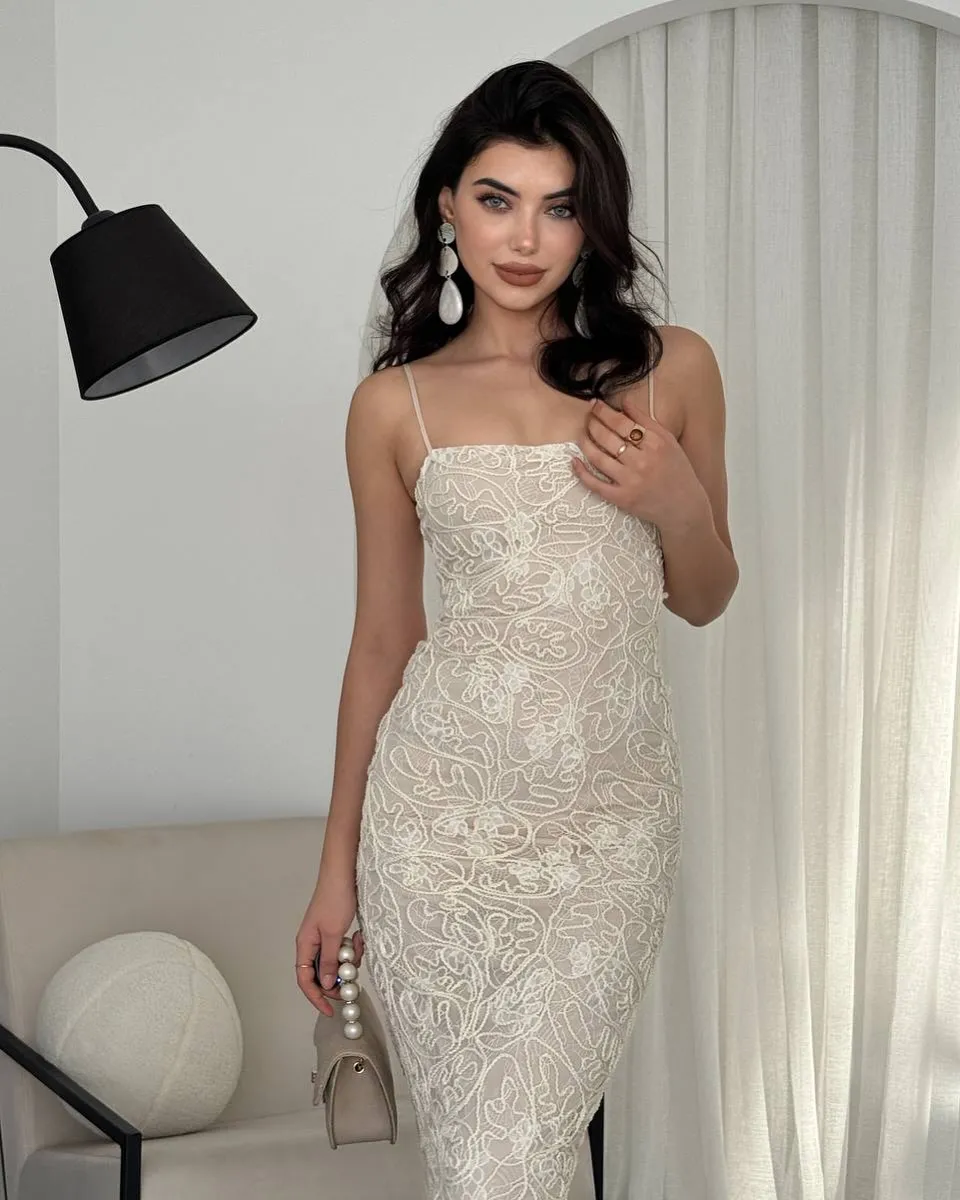 Ova uska midi haljina na bretele savršeno naglašava vašu figuru i donosi dašak romantizma u svakom koraku! Sa detaljima veza koji prelaze preko haljine, u nježnim cream nijansama, idealna je za elegantne prilike i večernje izlaske. Podstavljena za dodatnu udobnost i kvalitet, a ziper pozadi omogućava lakše oblačenje.