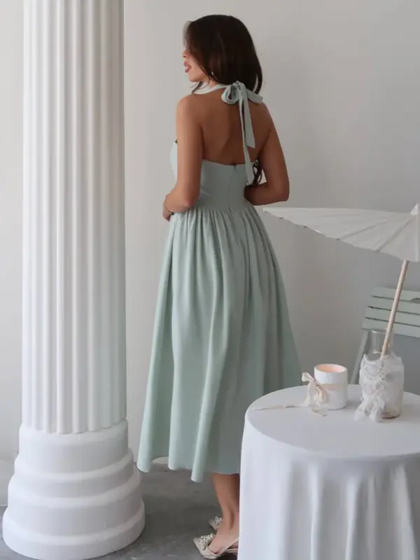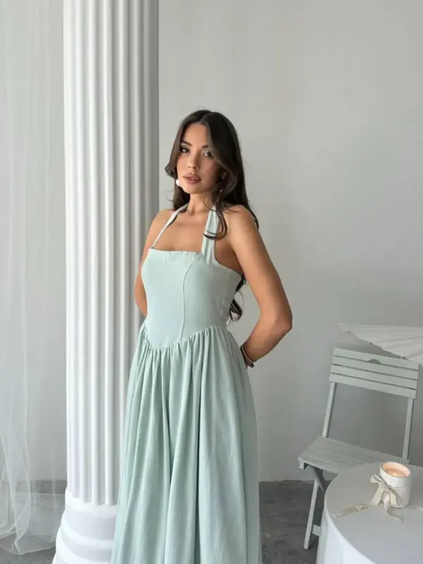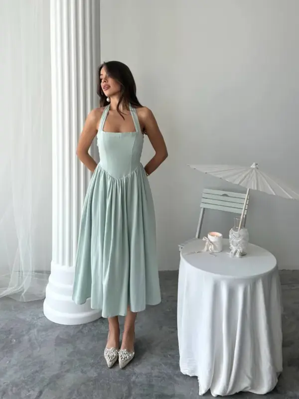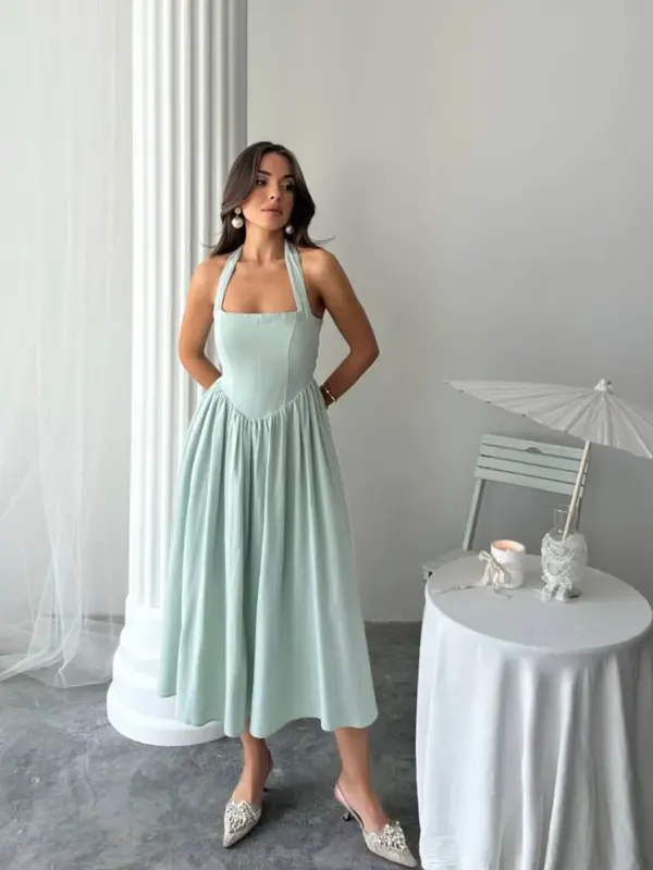 Midi haljina s romantičnim halter izrezom i vezanjem oko vrata. Gornji dio je krojen tako da lijepo oblikuje figuru, dok donji dio lepršavo pada stvarajući ženstven i elegantan izgled. Model je podstavljen radi dodatne udobnosti, a ziper na leđima omogućava lako oblačenje. Idealna za ljetne svečanosti, večere i posebne prilike.