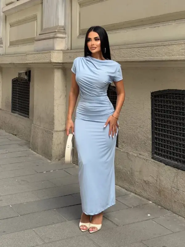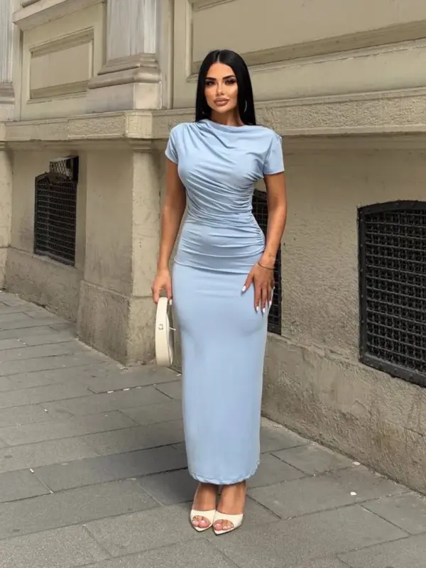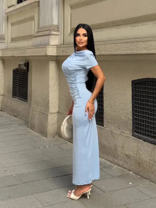 Ova sofisticirana midi haljinasavršen je spoj jednostavnosti i elegancije. Mekani materijal nježno prati liniju tijela, dok nabori u predjelu struka dodatno ističu figuru. Visoki zatvoreni dekolte i kratki rukavi pružaju balans senzualnosti i profinjenosti, a zatvarač pozadi omogućava lako oblačenje. Idealna je za večernje izlaske, svečane događaje ili posebne prilike.