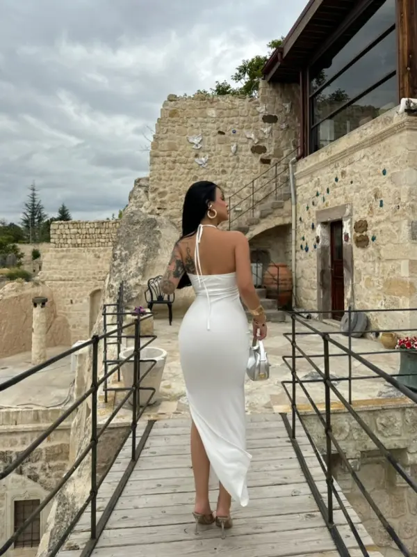 🔹 Detalji: Izrez ispod grudi, dekorativna kopča, bočni šlic
