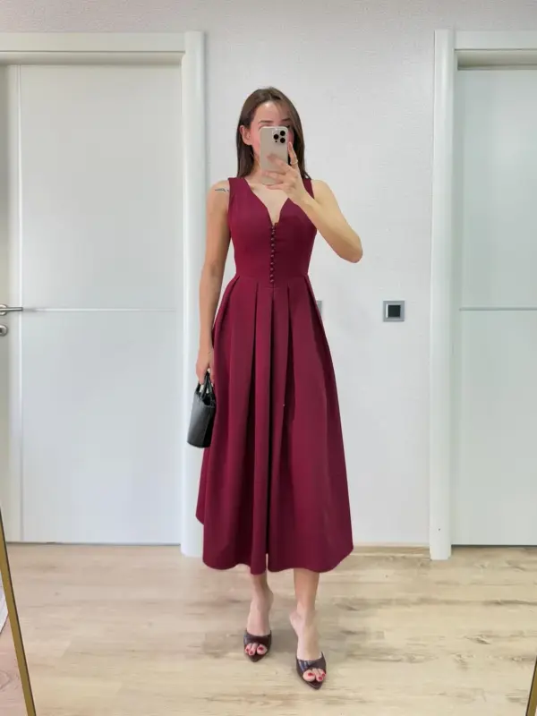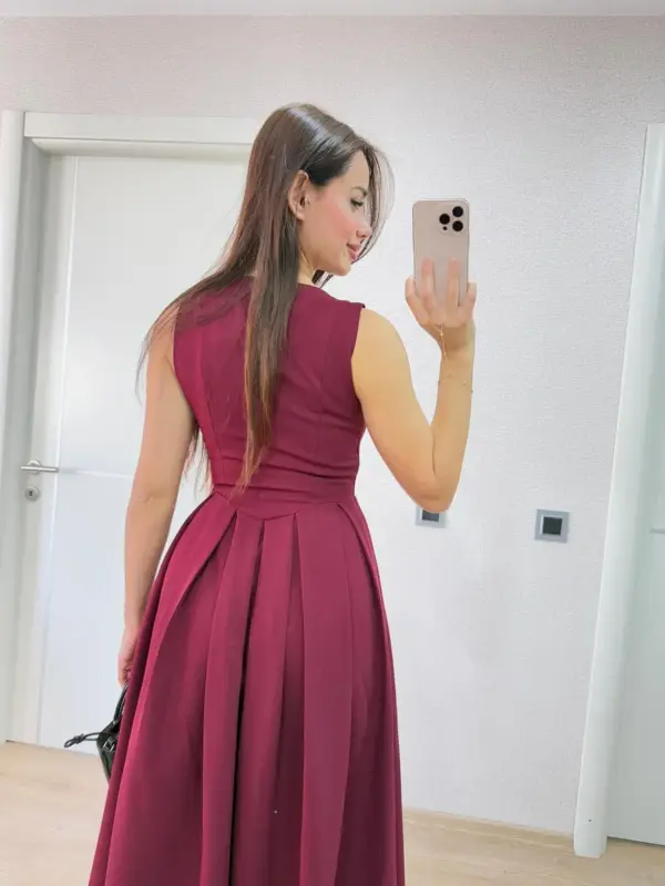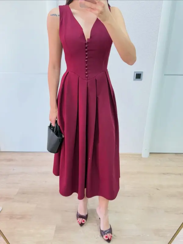 Budite prefinjeni i stylish u ovoj elegantnoj bordo midi haljini! Klasičan kroj bez rukava s dubokim V-izrezom i ukrasnim dugmićima sprijeda donosi sofisticiranu notu. Uski gornji dio lijepo naglašava figuru, dok široka suknja s naborima donosi lepršavost i eleganciju.