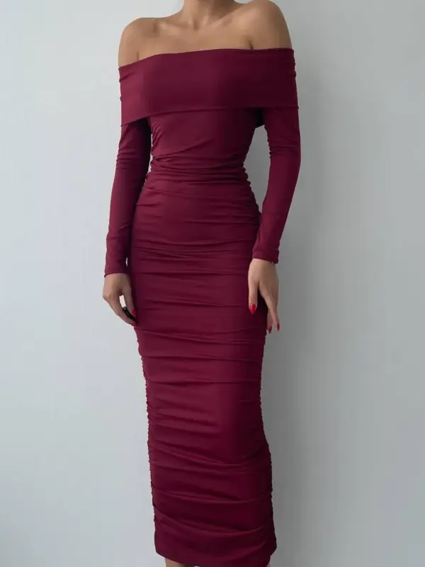 Ako tražiš haljinu koja izgleda wow bez puno truda, ova midi varijanta je pun pogodak. Mekana, elastična tkanina lijepo prati liniju tijela, dok nabori duž cijele haljine rade mini “photoshop” efekt uživo. Off-shoulder kroj dodatno naglašava ramena i dekolte, pa je idealna za večernje prilike, izlazak ili posebne evente.