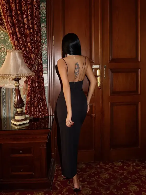 Ova prefinjena haljina savršen je izbor za svečane trenutke. Ravni kroj koji prati liniju tijela, prorez sa strane i otvorena leđa čine je efektnim, a nenametljivim statement komadom. Tanke naramenice diskretno ističu ramena i dekolte, dok dodatna postava u predjelu grudi pruža sigurnost i udobnost.