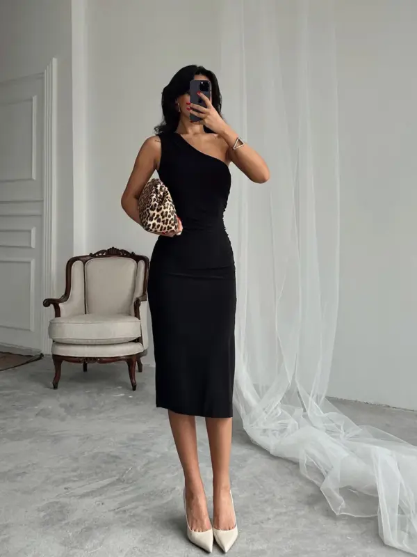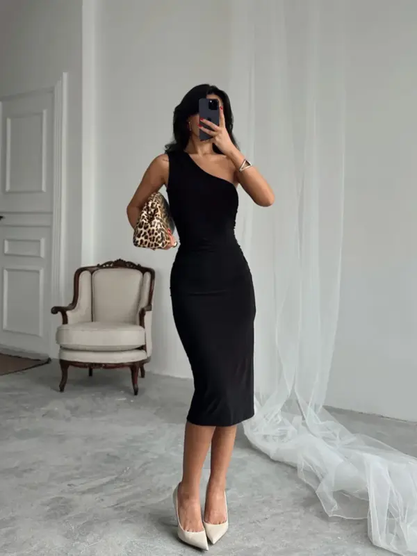 Asimetrični kroj, zavodljivi detalji na jednom ramenu i izrez sa strane čine ovu midi haljinu pravim izborom za posebne prilike. Mekani, lagano rastezljivi materijal nježno prati liniju tijela i ističe figuru, dok nabori sa strane vizualno dodatno oblikuju struk. Haljina je idealna za večernje izlaske, romantične večere ili svečanosti gdje želiš zablistati.
