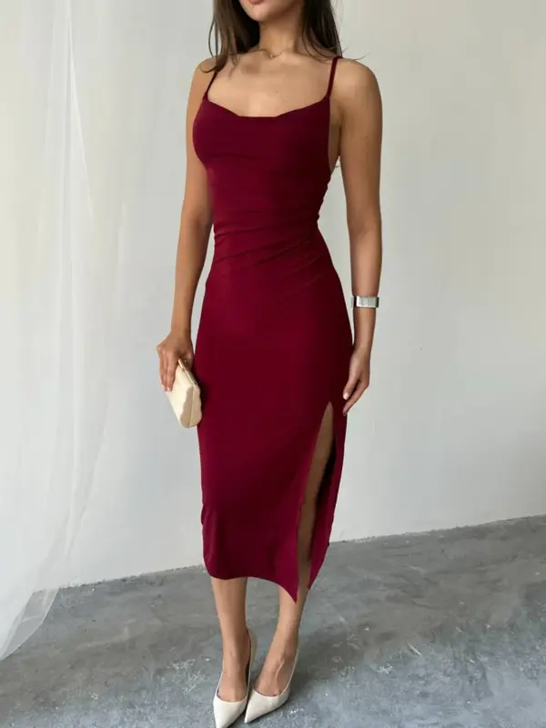 Osvojite poglede u ovoj senzacionalnoj midi haljini! Elegantni drapirani dekolte i tanke bretele donose dozu glamura, dok visoki prorez na nozi unosi dozu seksepila i drame. Uska silueta haljine prati liniju tijela i naglašava figuru.