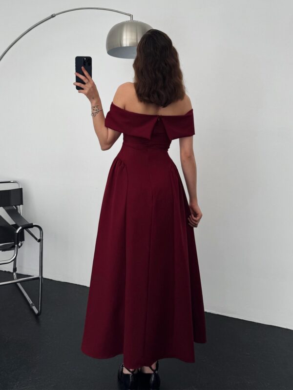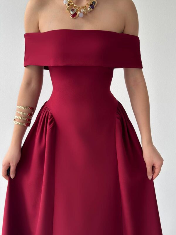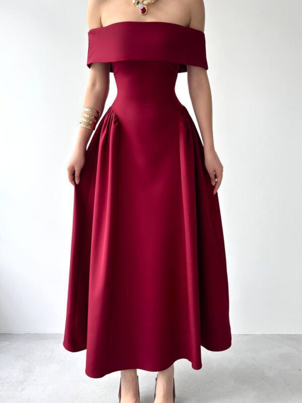 Elegantna off‑shoulder midi haljina s lepezastom suknjom
