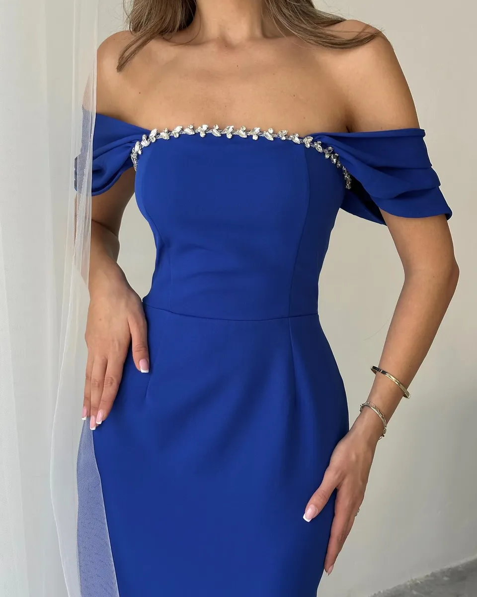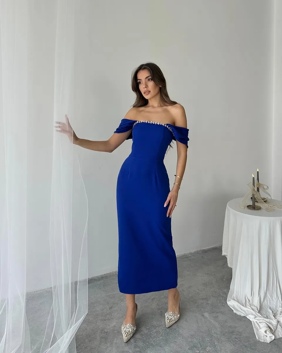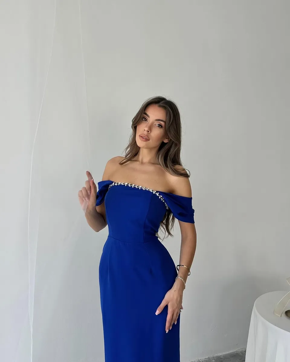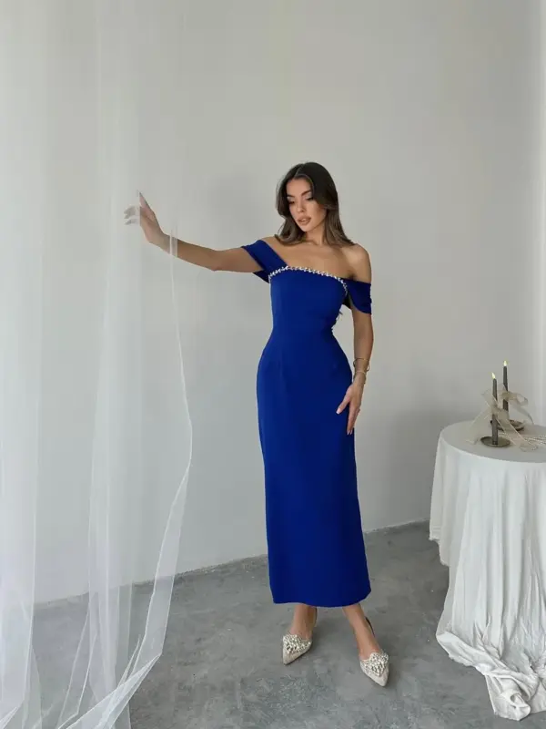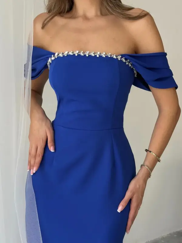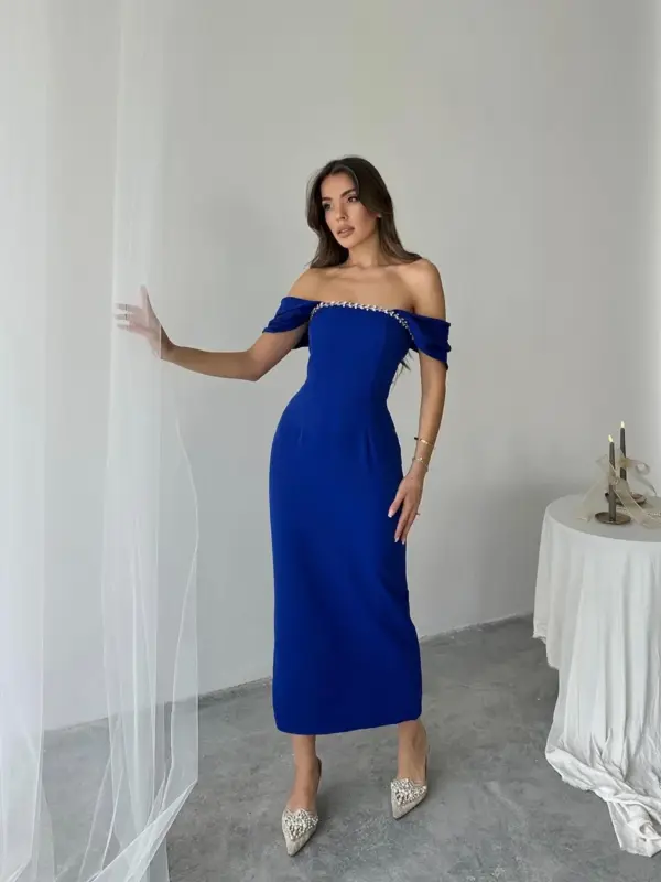 🔹 Dizajn: Midi dužina, bez naramenica, s elegantnim rukavima spuštenim preko ramena
