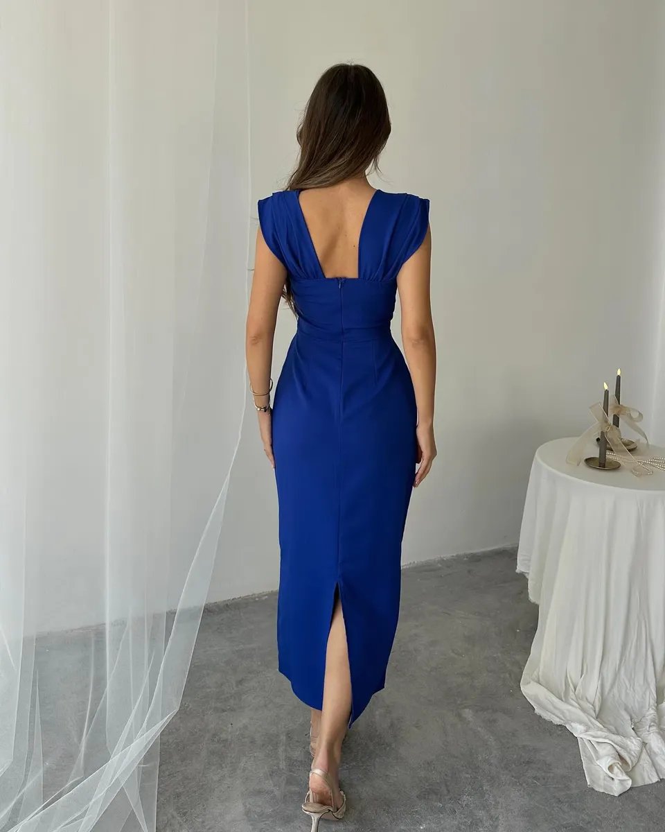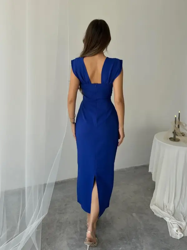 Elegantna midi haljina koja savršeno spaja ženstvenost i sofisticiranost – idealna za posebne prilike. S krojem koji prati liniju tijela i izraženim dekolteom, ova haljina ističe figuru na suptilan i profinjen način.