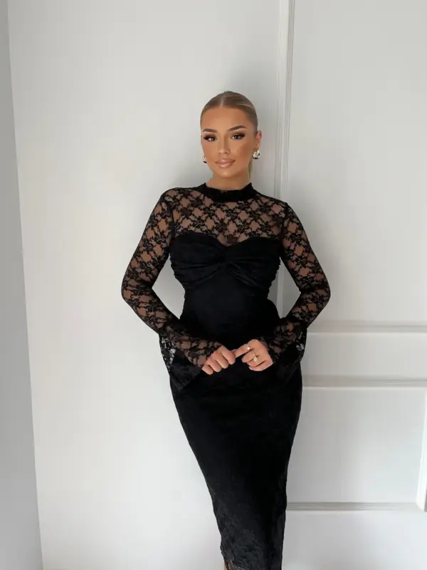 Midi haljina kombiniranog dizajna s podstavom i slojem čipke preko, koja pruža sofisticiran i romantičan izgled. Haljina ima zvonaste rukave i ovratnik, dok nabor u predjelu grudi naglašava grudi i figuru. Uski kroj prati liniju tijela, dok rubovi ostaju neobrađeni za dodatni vintage dojam. Zipper sa strane omogućava lako oblačenje, čineći ovu haljinu savršenom za elegantne i posebne prilike.