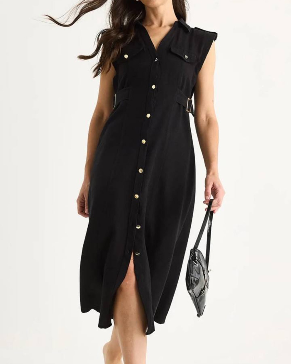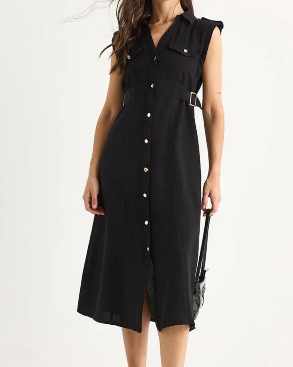 Košulja haljina bez rukava idealan je spoj klasike i moderne elegancije. Krojena u midi dužini, haljina prati liniju tijela, dok dugmad duž cijele prednje strane omogućavaju različite stilove nošenja – otvoreno, poluotvoreno ili zakopčano do kraja. Ima blago naglašena ramena i detalje poput džepova i metalnih kopči malo više struka, koji se može podešavati prema želji. Materijal je lagan i blago providan, a model dolazi nešto manji, pa se preporučuje uzeti broj veći za savršen fit.