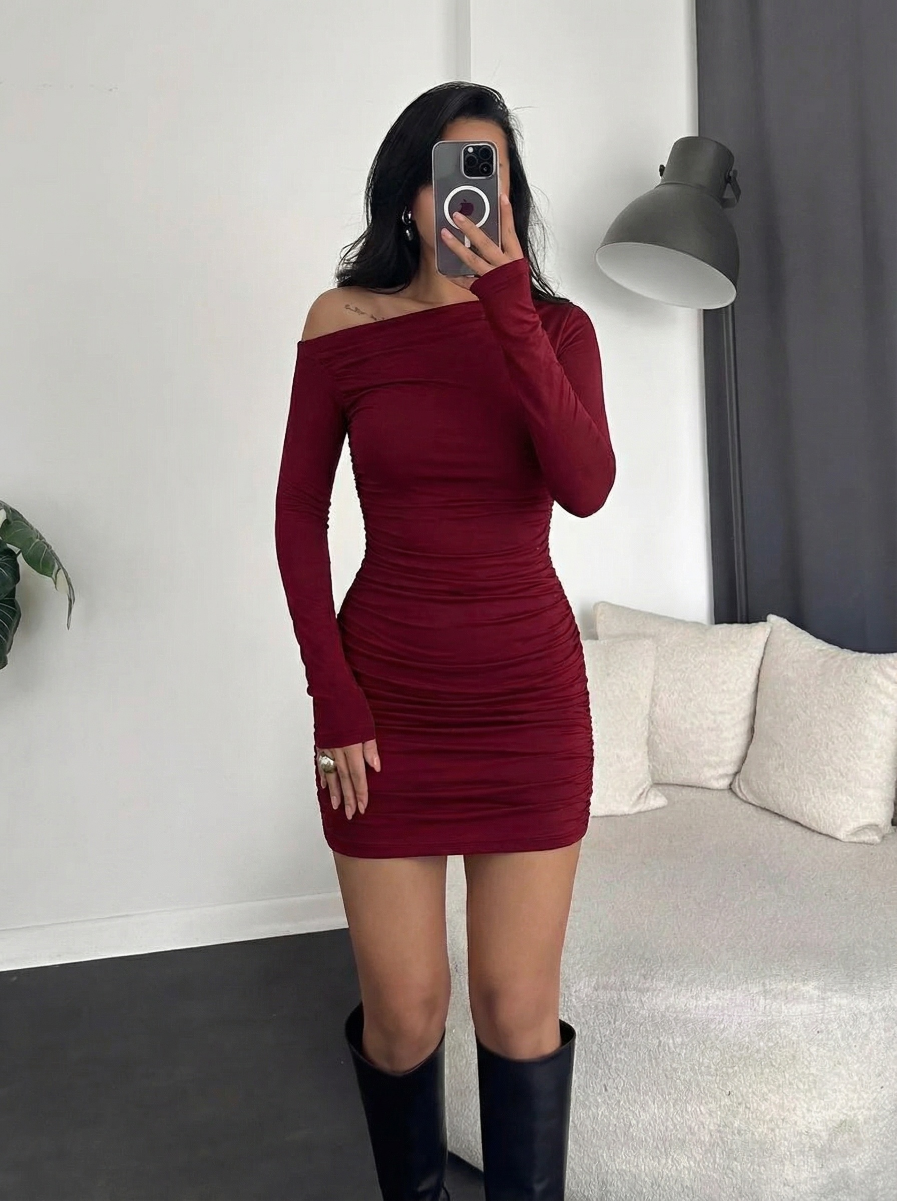 Mini haljina, elastična i asimetrična, prilagodljiva i udobna, savršena za isticanje figure.