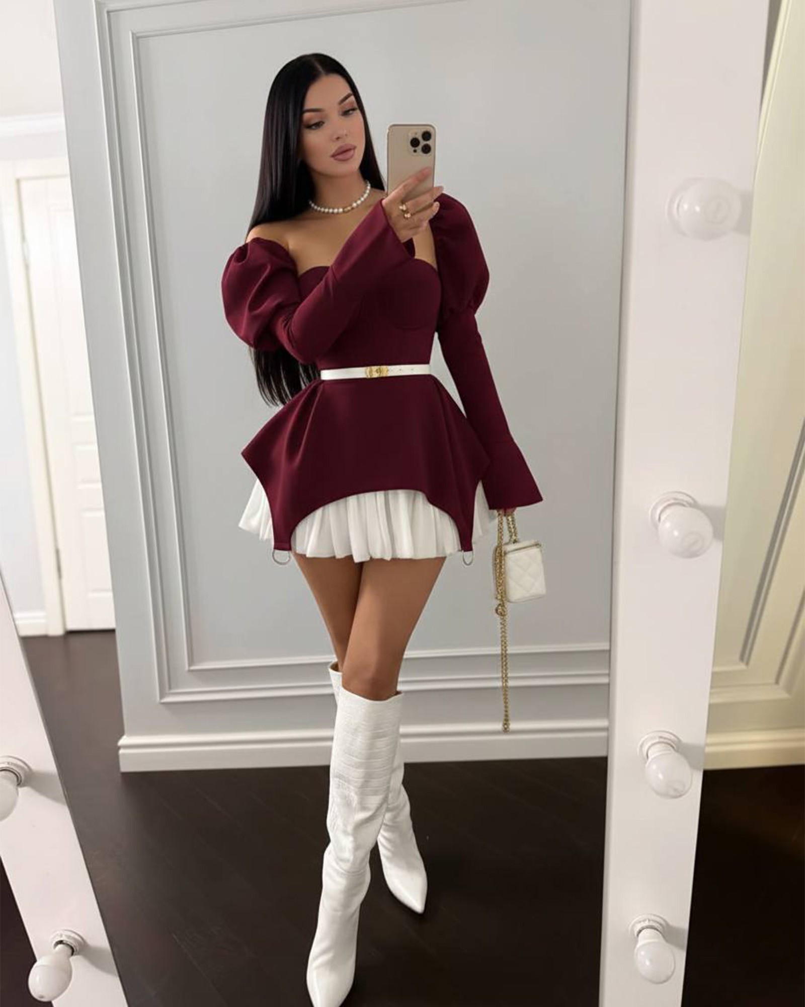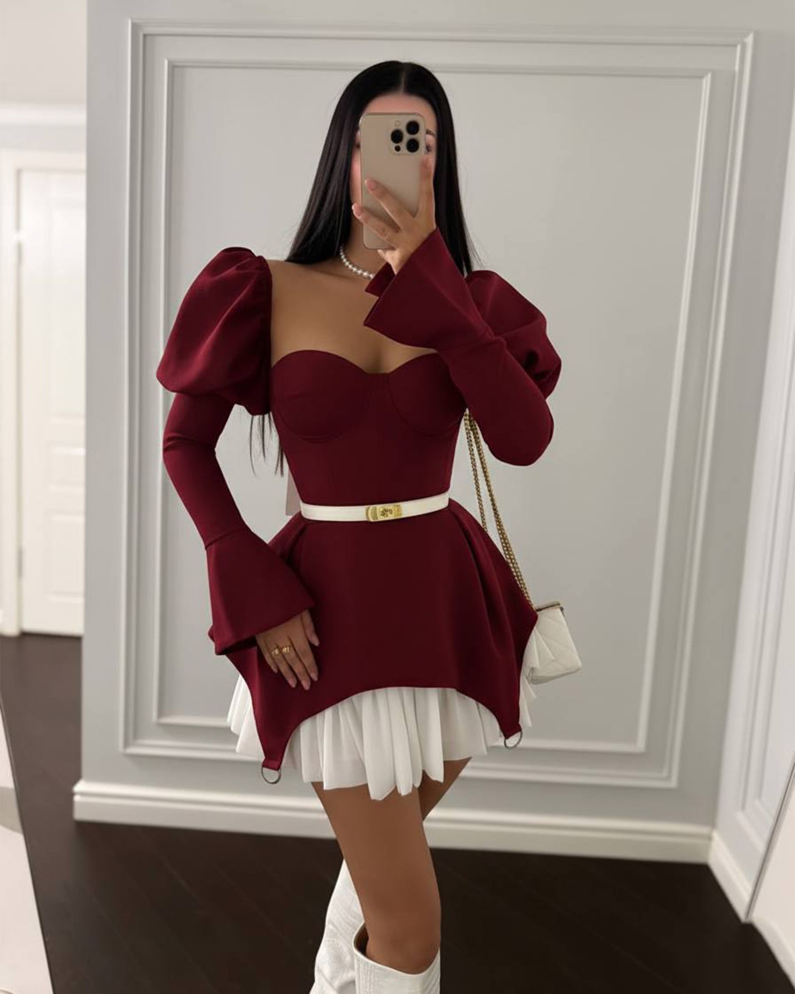 Ako tražiš haljinu koja ostavlja snažan utisak i istovremeno ističe figuru, ovaj model je pravi izbor. Kombinacija bogate bordo boje i bijelog plisiranog detalja daje sofisticiran, luksuzan izgled, dok kroj savršeno naglašava struk i gornji dio tijela.