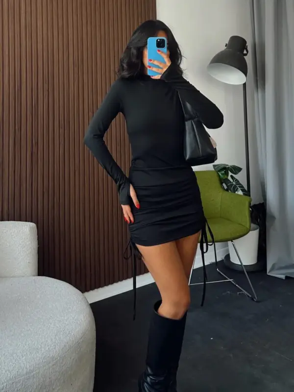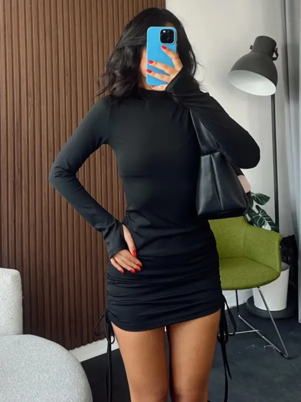 Mini haljina izrađena od čvrstog, neprovidnog materijala, savršena za party prilike. Haljina ima proreze na rukavima za prste i podesivu dužinu, što omogućava stiliziranje prema vašim željama. Uska i efektna, prati liniju tijela za moderan i zavodljiv izgled.