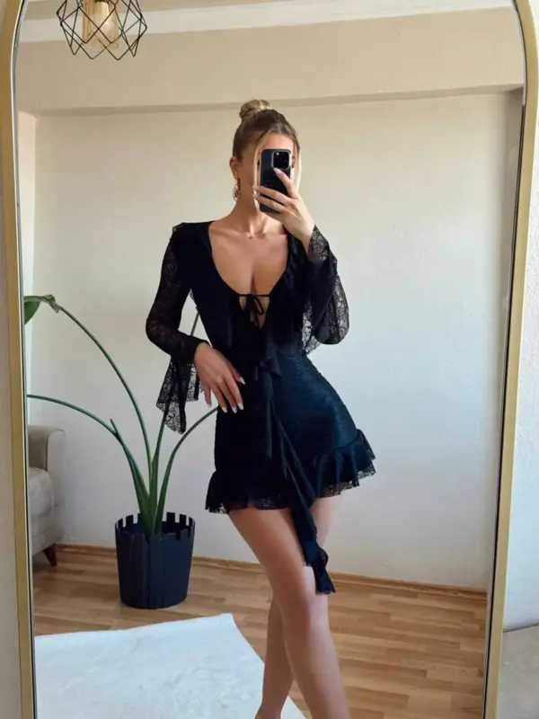 Ultra kratka uska mini haljina u retro stilu, dizajnirana za odvažne modne kombinacije. Haljina je dvoslojna, s podstavom i slojem čipke ukrašene volanima preko. Volani dodatno krase porube rukava i dekolte, naglašavajući ženstvenost. Rubovi nisu obrađeni.