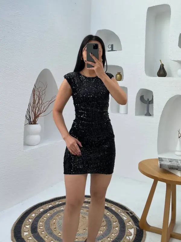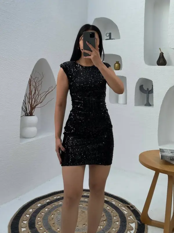 Jednostavna mini haljina sa šljokicama koje ne opadaju, nego su sastavni dio materijala, idealna za večernje izlaske i svečane prilike. Spužve na ramenima daju elegantan oblik, a praktičan zipper na leđima olakšava oblačenje.