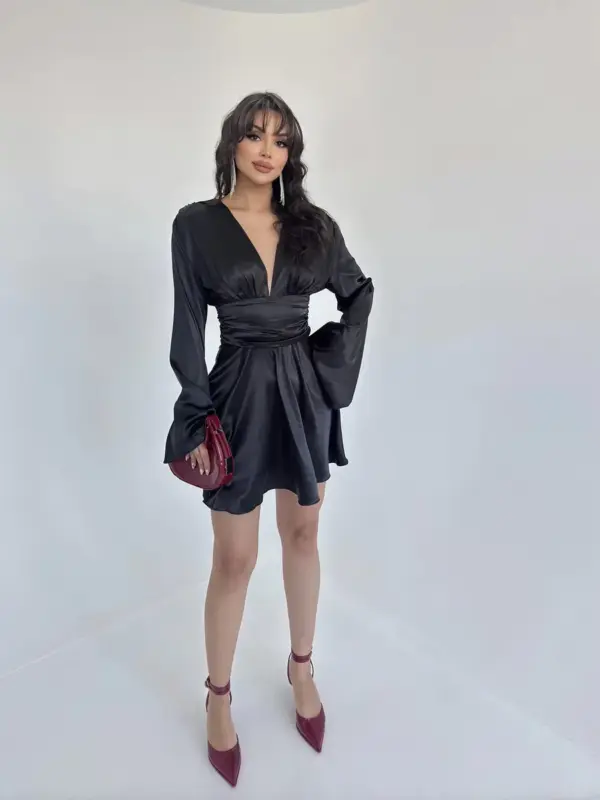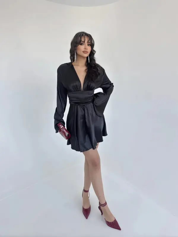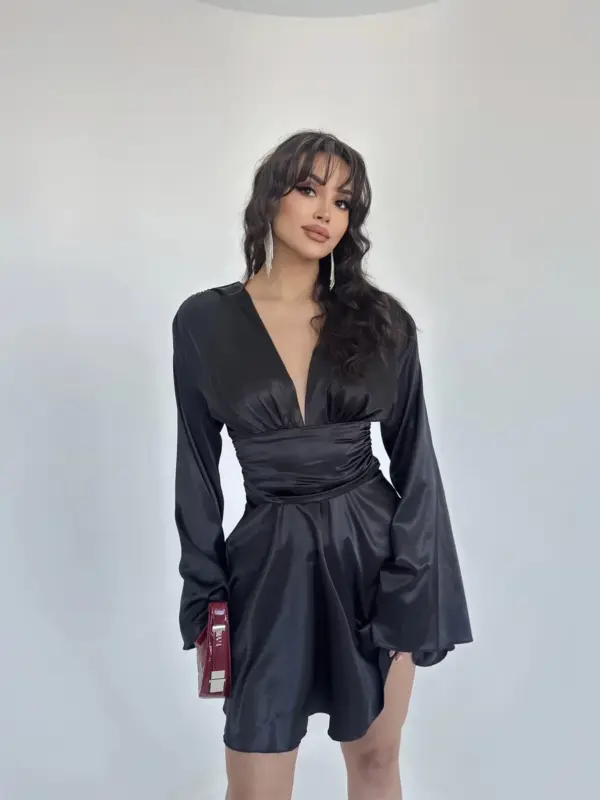 Unesite dozu glamura i sofisticiranosti uz ovu lepršavu mini haljinu od satena, savršenu za posebne prilike. Široki zvonasti rukavi i duboki dekolte daju ženstvenu siluetu, dok presjek u struku ističe vašu figuru. Haljina se blago širi prema dnu, dodajući elegantan i romantičan efekt.