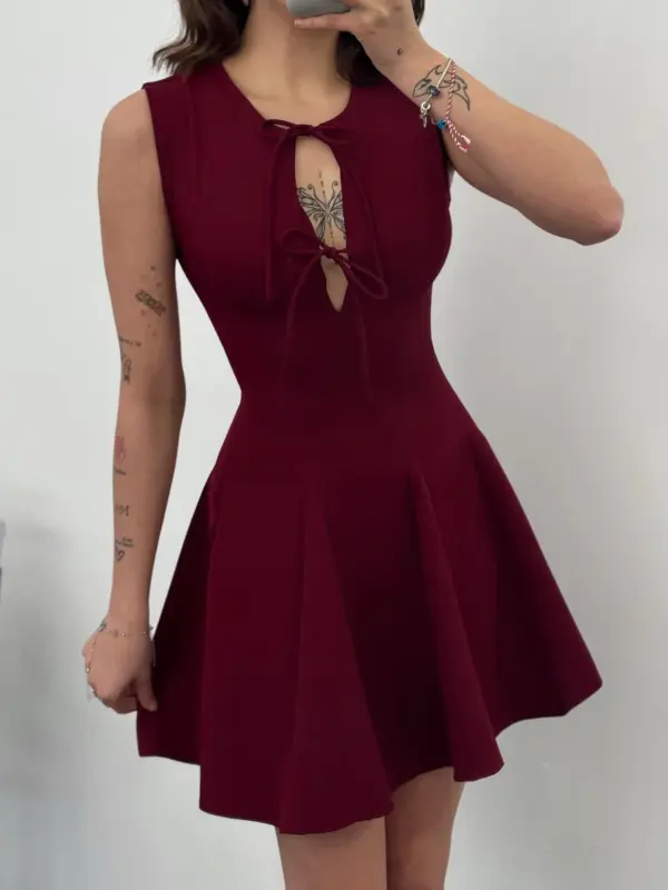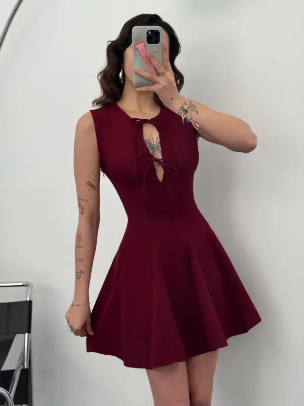 Ova ženstvena i sofisticirana mini haljina savršen je spoj elegancije i lepršavosti. Strukirana silueta naglašava figuru, dok se donji dio lagano širi, pružajući fluidnost i lagan pad. Detalj vezanja naprijed dodaje poseban šarm i dozu romantike.
