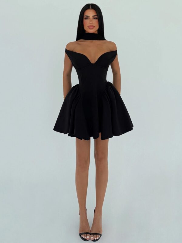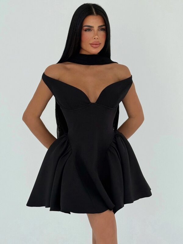 Savršeno krojena za naglašenu strukiranu siluetu, ova mini haljina bez naramenica ističe gornji dio tijela elegantnim V izrezom u području grudi i mekanim naborima na bodiju. Lepršav A-kroj suknje s diskretnim bočnim nabiranjima stvara voluminozan i zavodljiv efekt, dok dugi plisirani šal koji pada preko ramena unosi dodatnu dozu glamura.