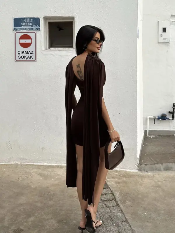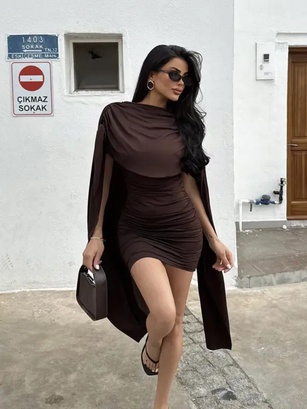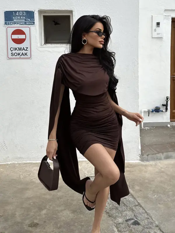 Ova mini haljina s efektnim plašt rukavima je statement komad koji će privući sve poglede! Raskošna draperija oko ramena, naglašeni struk i pripijeni kroj savršeno oblikuju siluetu. Materijal je lagano rastezljiv i udoban za nošenje, dok zadnji dio otkriva leđa za dodatni “wow” efekat.
