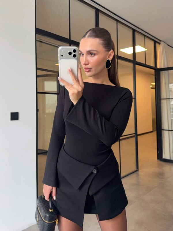 Ova mini haljina je idealna za sve koji vole čist, moderan i sassy look. Glavni detalj je dodatni sloj preko, koji izgleda kao mini suknja i daje zanimljiv, asimetričan efekat. Super kratka dužina čini je pravim statement komadom.