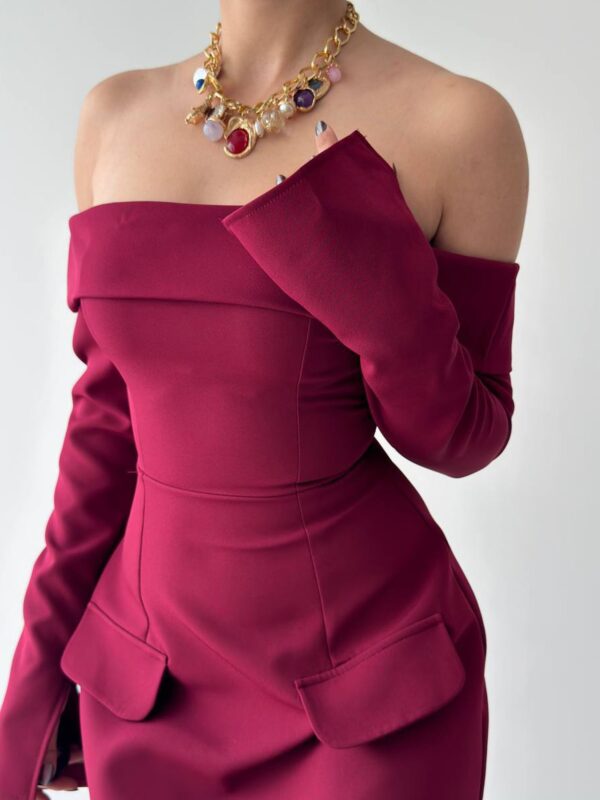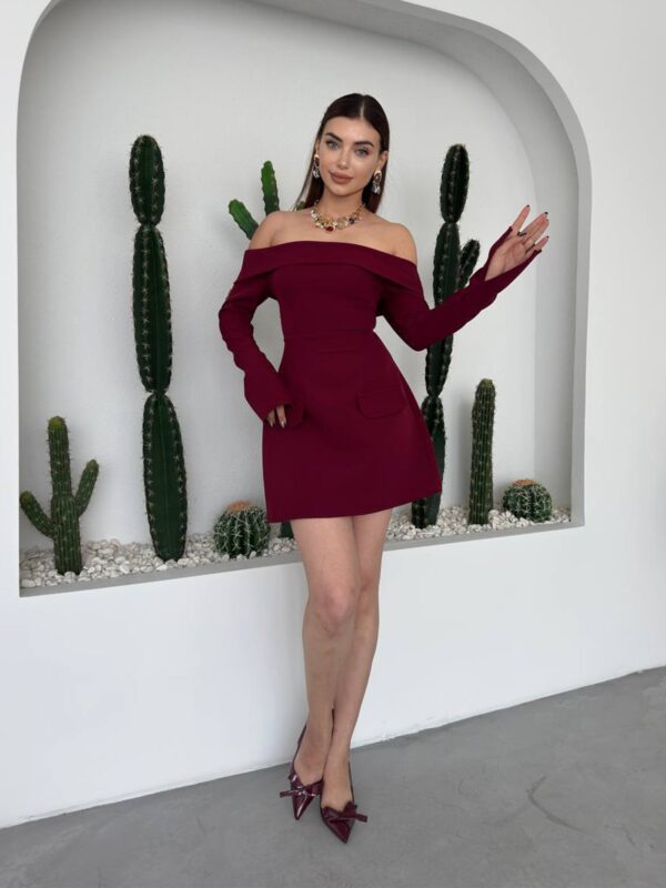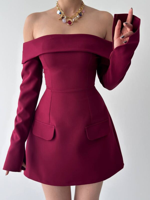Ženstvena mini silueta s preklopljenim bardot izrezom i dugim rukavima s diskretnim prorezom na rubu. Struk je fino definisan, a blago A-kroj donjeg dijela lijepo balansira figuru. Dekor “džepni” preklopi dodaju modni twist.