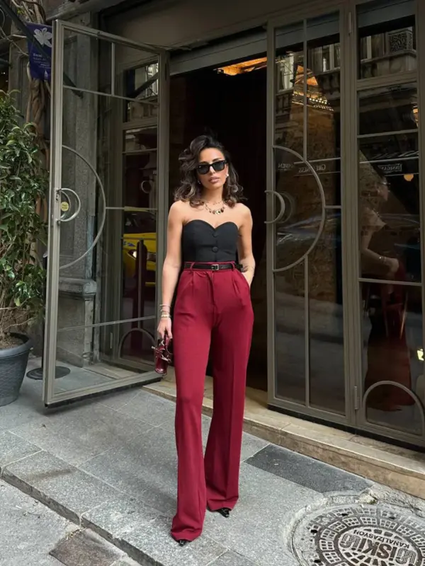 Palazzo hlače visokog struka sa širokim nogavicama koje se blago šire prema dnu, pružajući elegantan i sofisticiran izgled. Savršene za formalne i poslovne kombinacije.