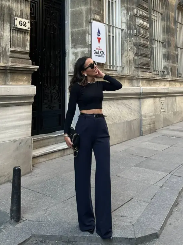 Palazzo hlače visokog struka sa širokim nogavicama koje se blago šire prema dnu, pružajući elegantan i sofisticiran izgled. Savršene za formalne i poslovne kombinacije. Guma na zadnjem dijelu dodatno osigurava savršeno prilagođavanje struku. Skriveno kopčanje.