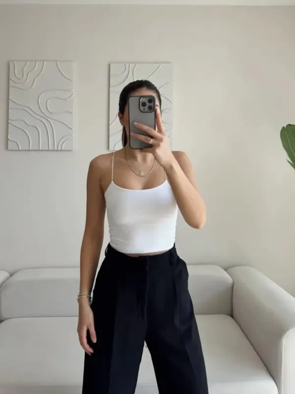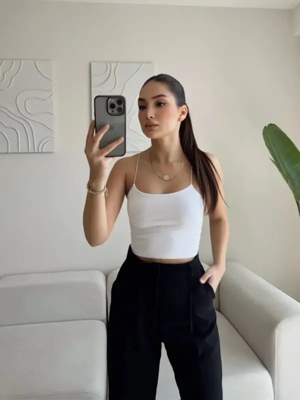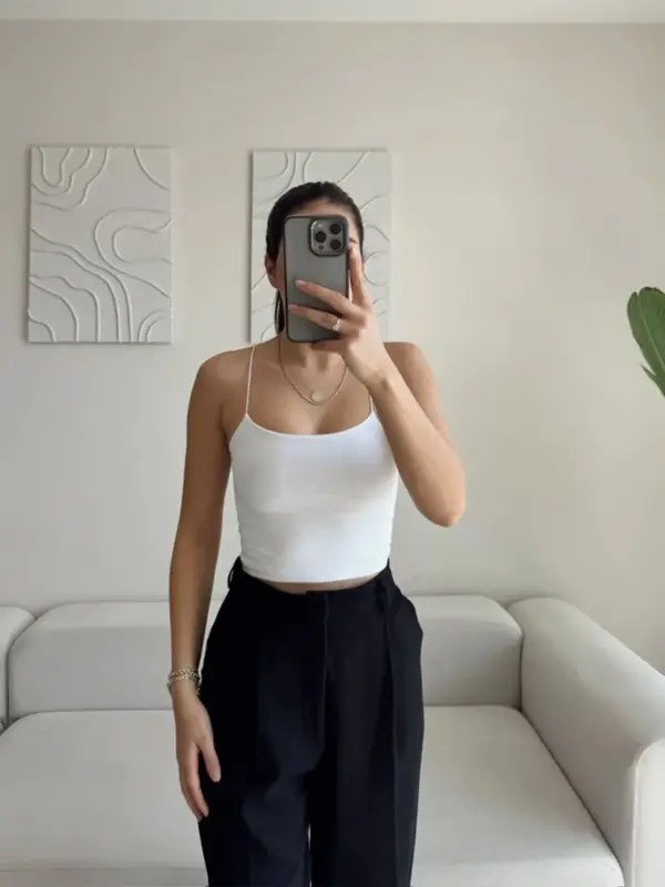 Basic komad – bijeli crop top s tankim bretelama i podstavljenim prednjim dijelom! Izrađen od mekanog pamuka s elastinom, ovaj top pruža savršenu udobnost i rastezljivost, prilagođavajući se vašoj figuri.