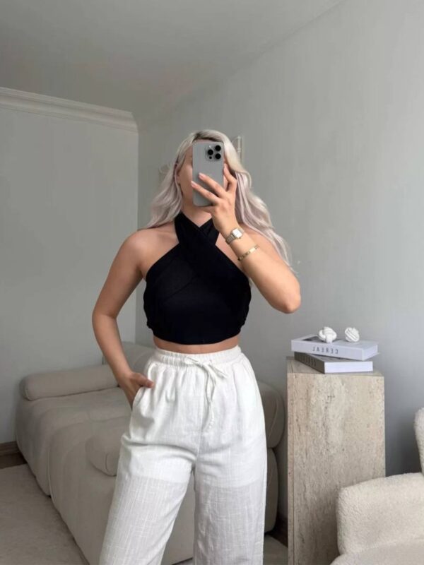 Ovaj atraktivni top predstavlja idealan spoj minimalizma i odvažnog detalja. Prednji dio oblikovan je križnim preklopima koji stvaraju halterneck izrez, otkrivajući ramena i nježno ističući dekolte. Leđni rub opremljen je širokom elastičnom trakom koja osigurava pouzdano prianjanje i udobnost bez dodatnih zatvarača. Skraćena dužina topa naglašava struk i savršeno se uklapa u kombinacije visokog struka.